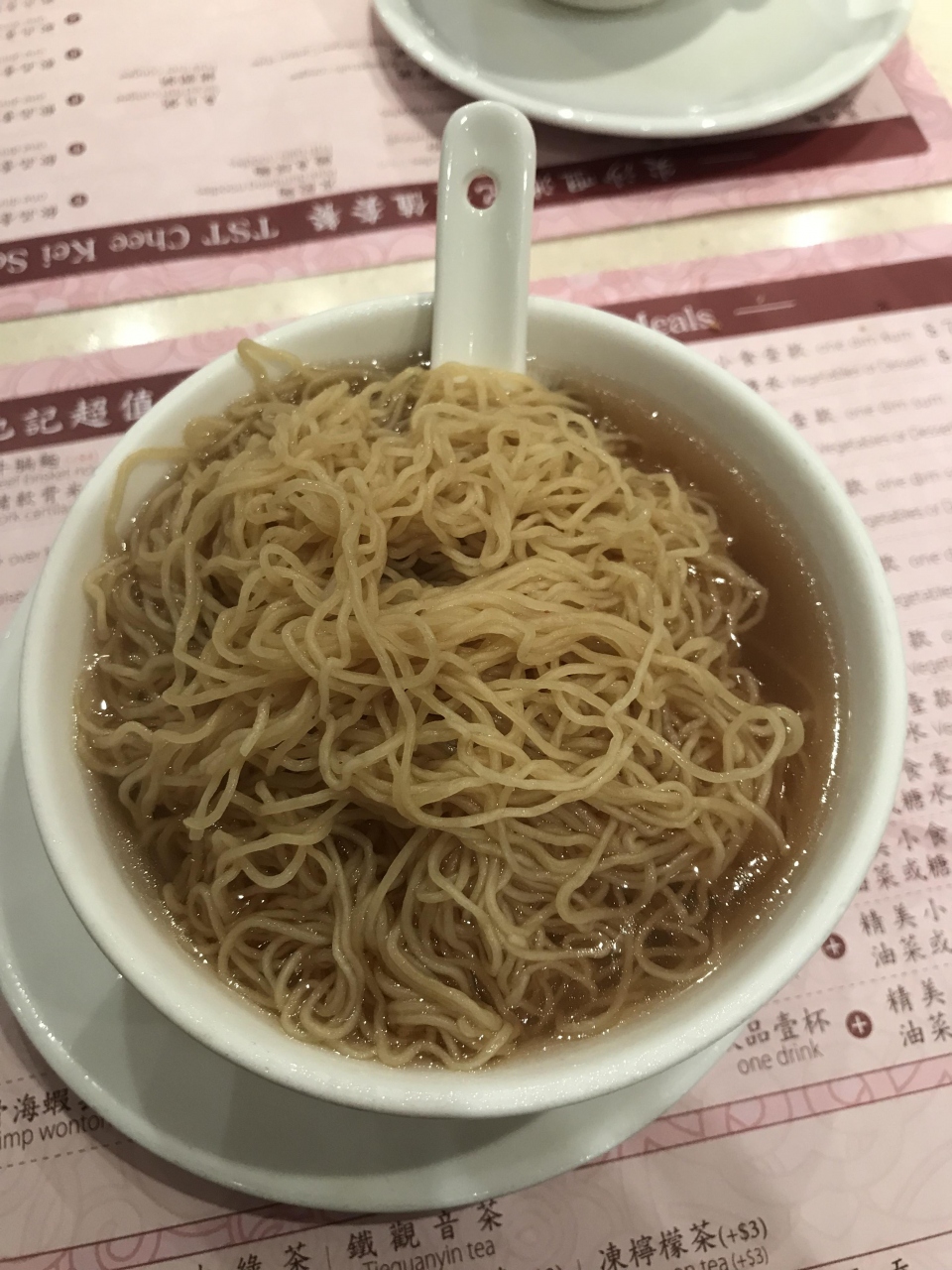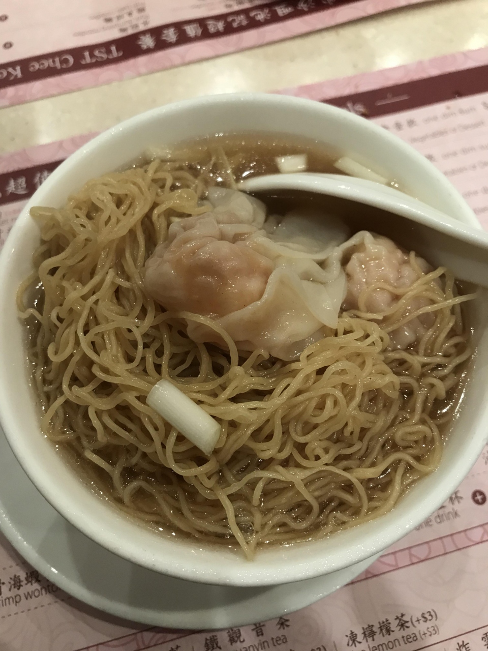雲呑が美味しいです。小さめの器にこれでもかというくらいの縮れ麺が入っています。器からスープが溢れて下で受けている皿が有難い。