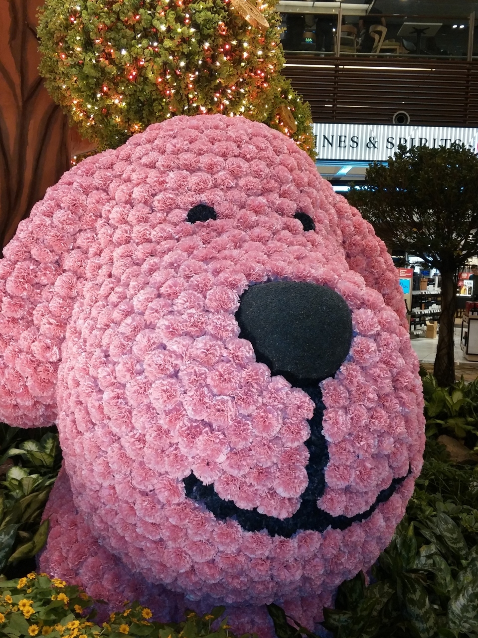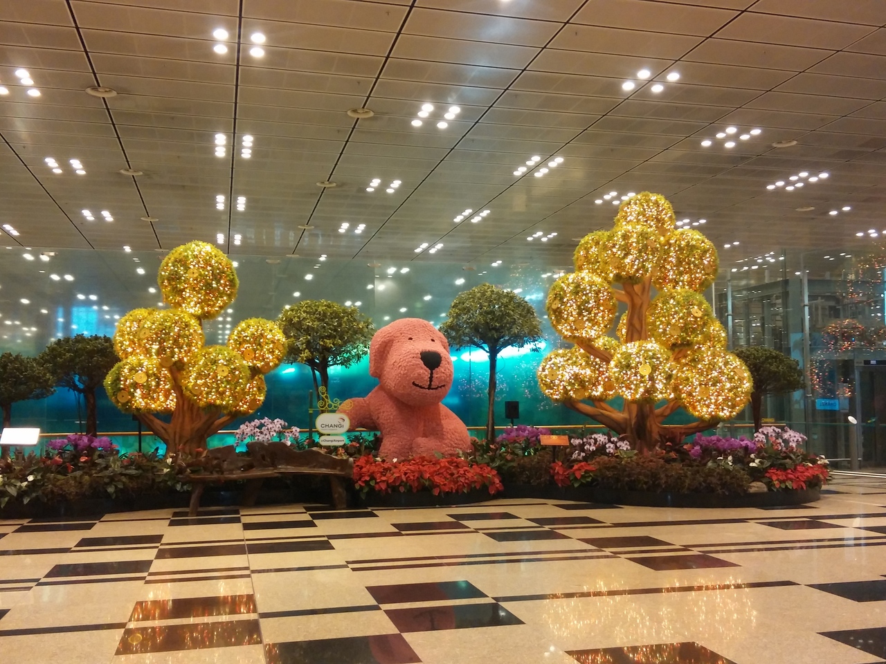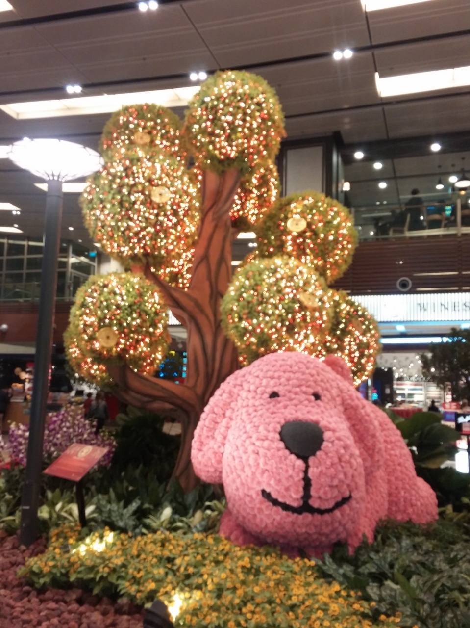 空港内もトレインで結ばれ移動が簡単です。市内までも空港直結の地下鉄でアクセスできます。1月から正月用の飾り付けが始まるらしく、いつも楽しいモニュメントが見られます。2018年の今年は戌年。カーネーションで作られた特大の犬が中央に座っていました。空港内のTipTopというお店は、小腹が空いている時に便利でお勧めです。テイクアウェイも出来るのでアテンダントさんも購入していました
