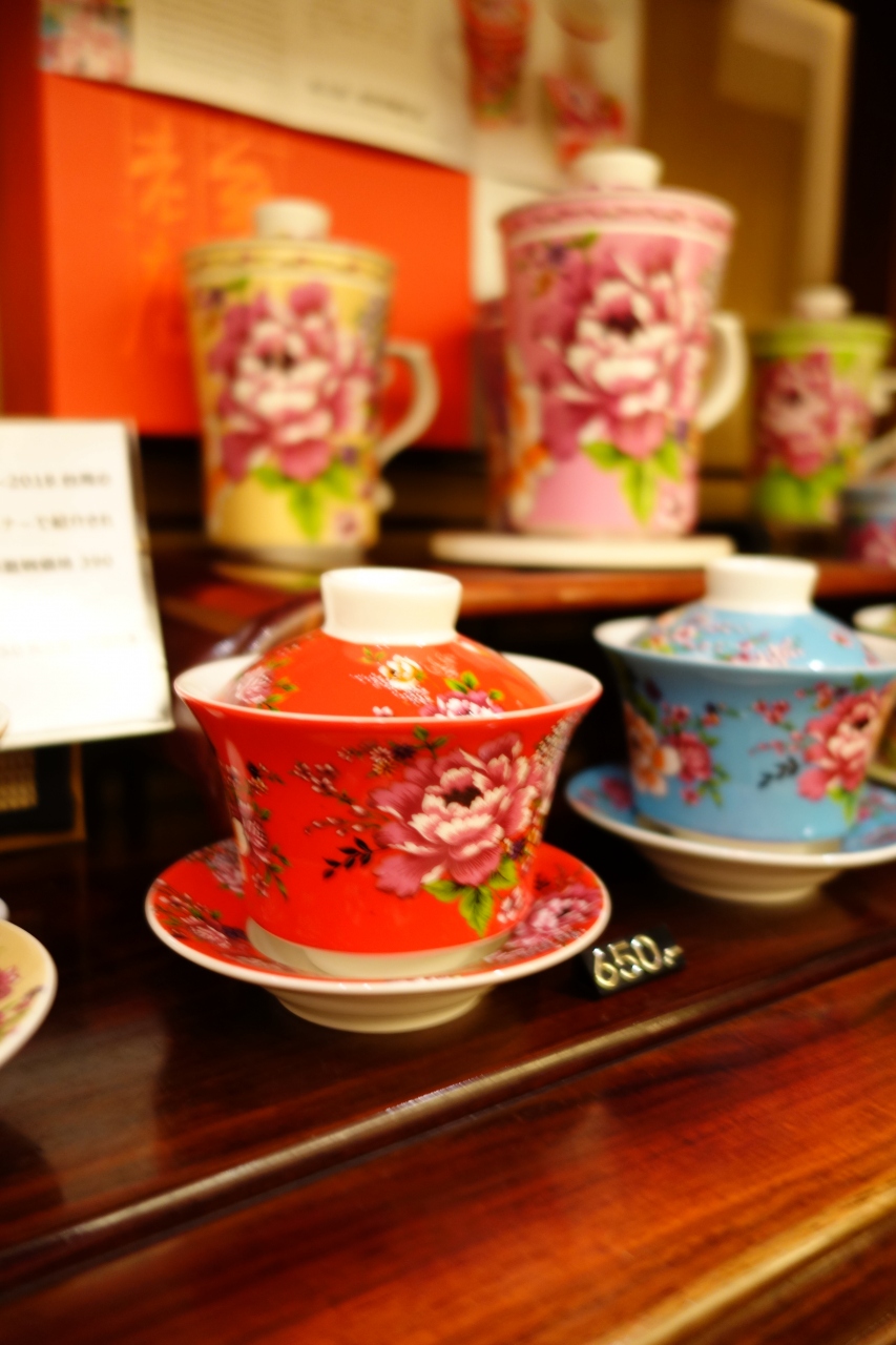 私は蓋のついた客家花柄の茶器を買うと決めていたのですが・・・あら、意外に小さく手のひらサイズ。5色セットの吉響杯もありましたがこちらも小さめ、お猪口くらいの大きさでした。