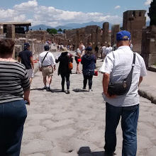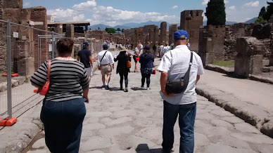 ポンペイの街を東西に伸びる目抜き通りで、通り沿いには、浴場や洗濯屋、バールなどの跡が残っています。馬車が通る道と歩道とが分かれていて、当時の様子を思い浮かべることができました。6月の訪問時は、快晴で日差しは強く徒歩散策は結構きつかったでした。