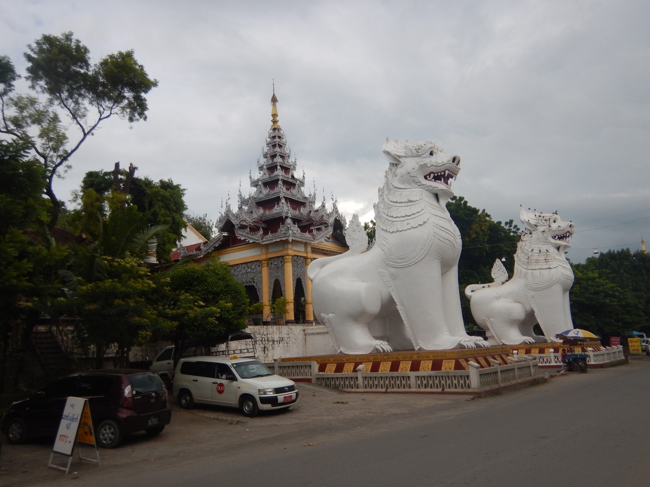 マンダレーヒルの参道の入口に立つ2頭の大きなライオン像を見る。日本の神社などの入り口に立っている狛犬と同じようなものだろう。