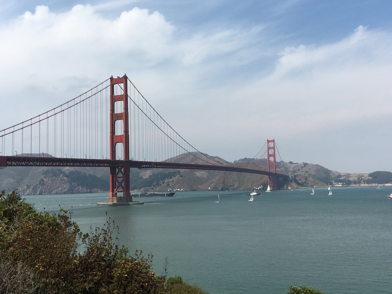バスを乗り継いで行きました。サンフランシスコ一の観光スポットなので、みんな降りるので分かりやすかったです。橋のふもとは写真を撮れるスポットがいっぱい。お土産屋さんやトイレ、カフェもあります。絵に描いたような橋で、青空に映えてとても綺麗でした。帰りもバスを使おうと思いましたが、乗り場が分からず、、タクシーで戻りました。