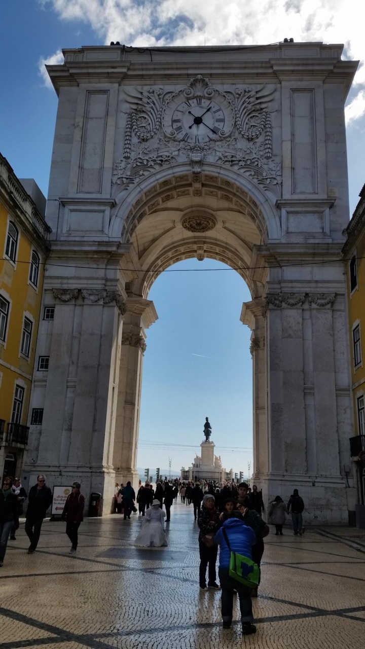 ツアーの自由時間に訪問しました。りベイラ市場から右手方向にぶらぶら歩いて行きました。海のように見えるテージョ川を右手に見て、左手に凱旋門(勝利の門)が見えます。広場にはドンジョゼ1世の騎馬像があります。観光客が多いです。