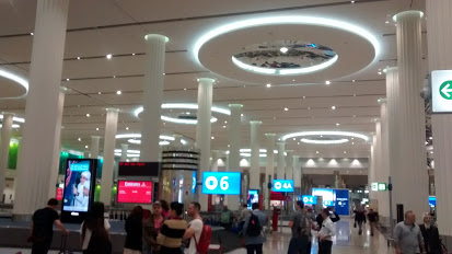 超近代的なドバイに初めて訪問ということでワクワクしていたら、空港でびっくりでした。飛行機へ預けた荷物を引き取る場所を写真で撮りましたが、天井は高く、円柱も照明も宮殿みたいなつくりで、たいへんきれいでした。