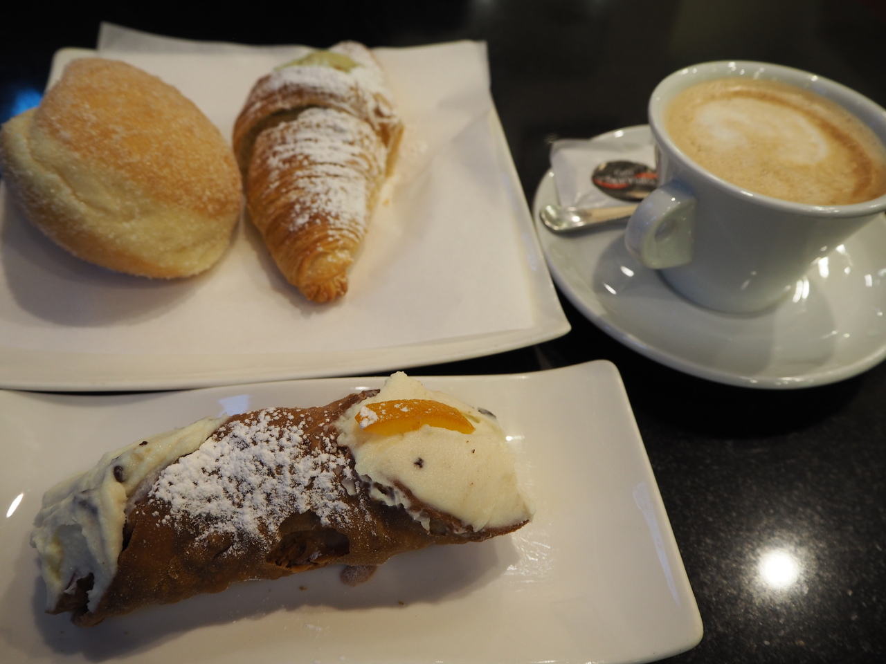 早朝のフェリーで到着後、8時前くらいに朝食を食べに行きました。小洒落た雰囲気の通りに位置し、お店も大変綺麗で素敵です。既に何種類かパンが並んでいて、私たちはピスタチオのクロワッサン、ドーナツ、カンノーロを購入。それにコーヒー2つで合計8ユーロでした。パンはどれも甘すぎず美味しかったです。店内のテーブルで頂きました。