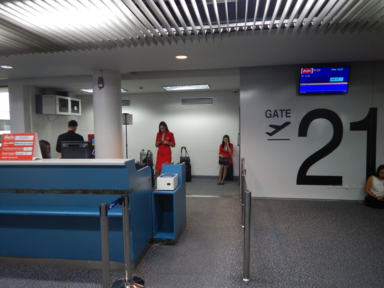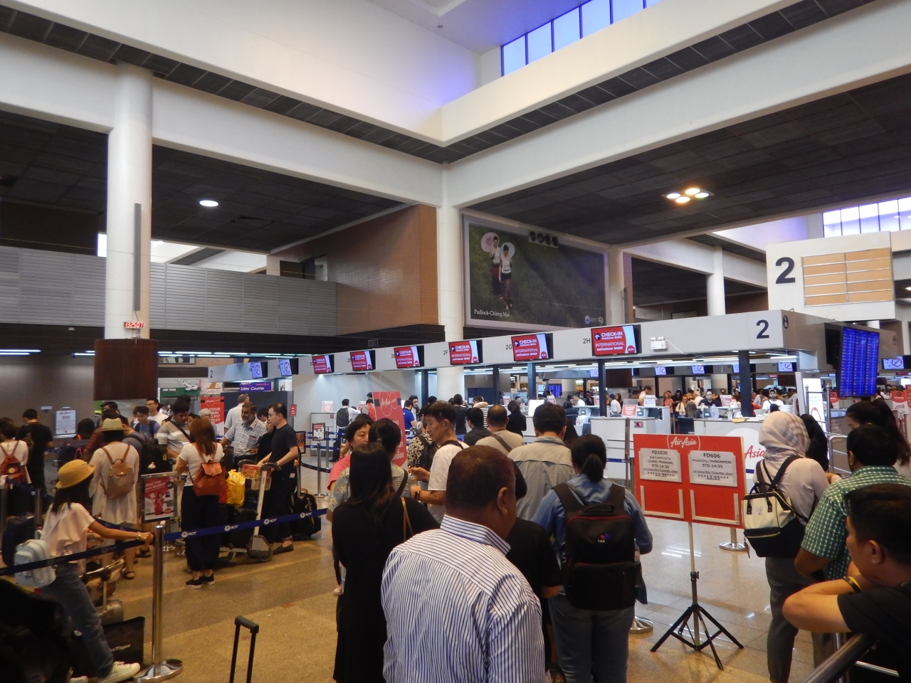 エアアジアでバンコクからヤンゴンへ移動しようとした。この日は10月6日。中国の国慶節休暇に当たり、中国へ帰国する人で大混雑したいた。エアアジアのチェックインも混んでいたが、それ以上に混んでいたのが出国手続き。1時間以上も並んだ。制限区域に入ると混雑は一段落していた。この時期は早めに空港に来る必要がある。