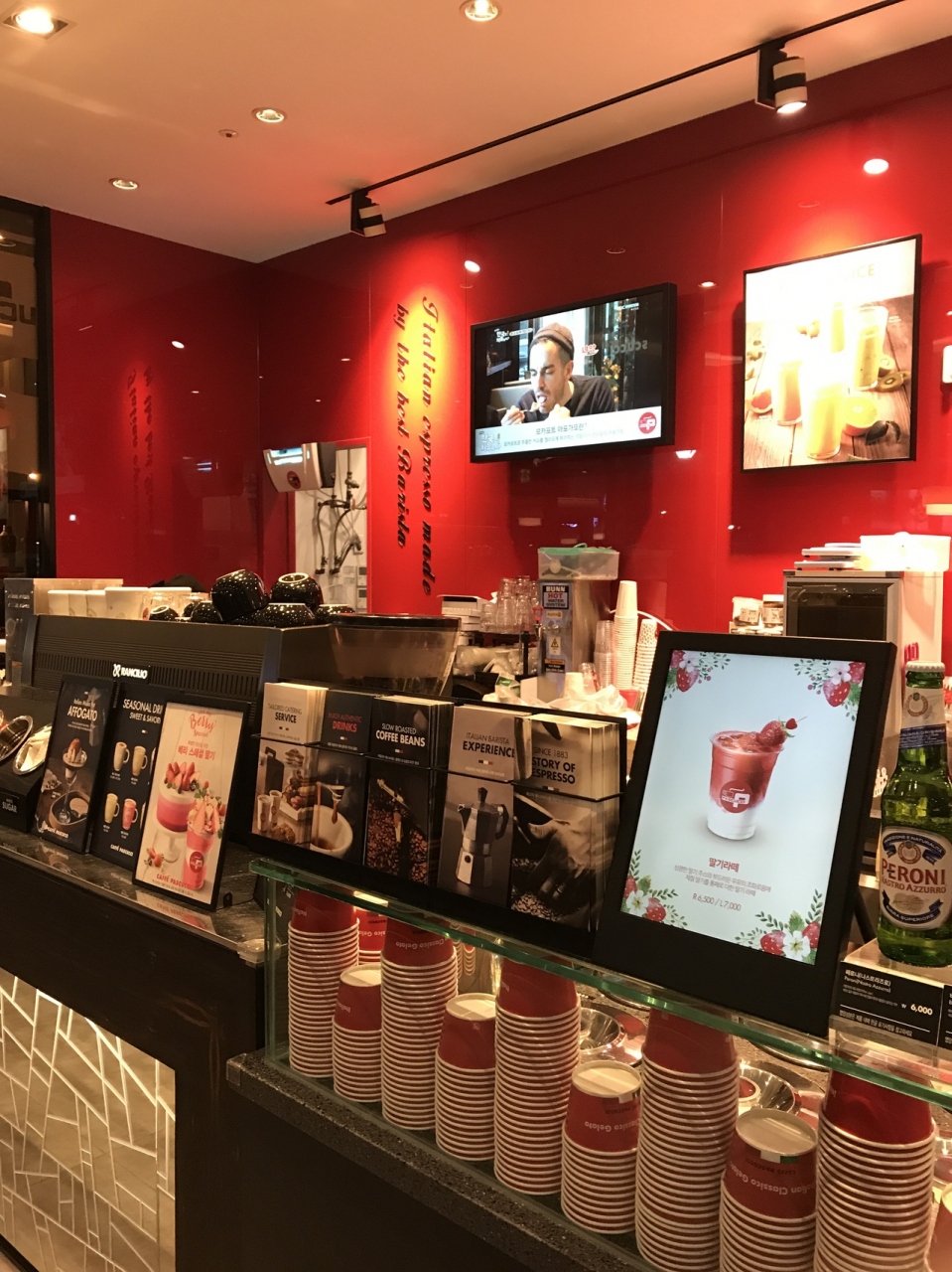 何処にでもありますが大抵一階にあり便利なカフェです。最近、明洞は二階にカフェが多くなり階段が辛いので。こちらはケーキやドリンクが新作も多く カフェ自体もカラフルで綺麗で気持ちが高鳴ります。韓国はカフェが高いので 少しでもゆっくり出来る店がいいですね