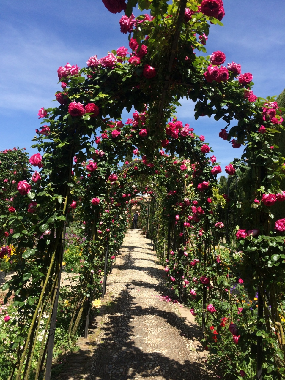 ゴールデンウィークにいきました。緑も花も綺麗で、広さもじゅうぶんにあります。入口の垣根からすごいインパクト。バラの綺麗なアーチや、池(緑ですがね、、)見所の多い庭です。グラナダの街が一望できる場所もあります。