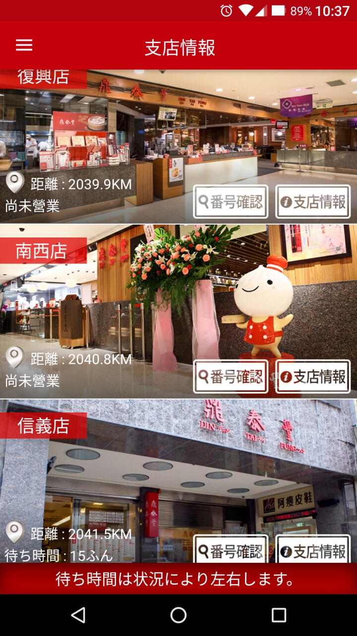 ところで鼎泰豊のアプリがあることを知りインストールしてみました。順番の券はさすがに店舗へ行かないともらえないようですが、「今何番まで呼ばれた?」がわかります。行く前なら「どの店舗が今何分待ち」とかの混雑状況も一発です。