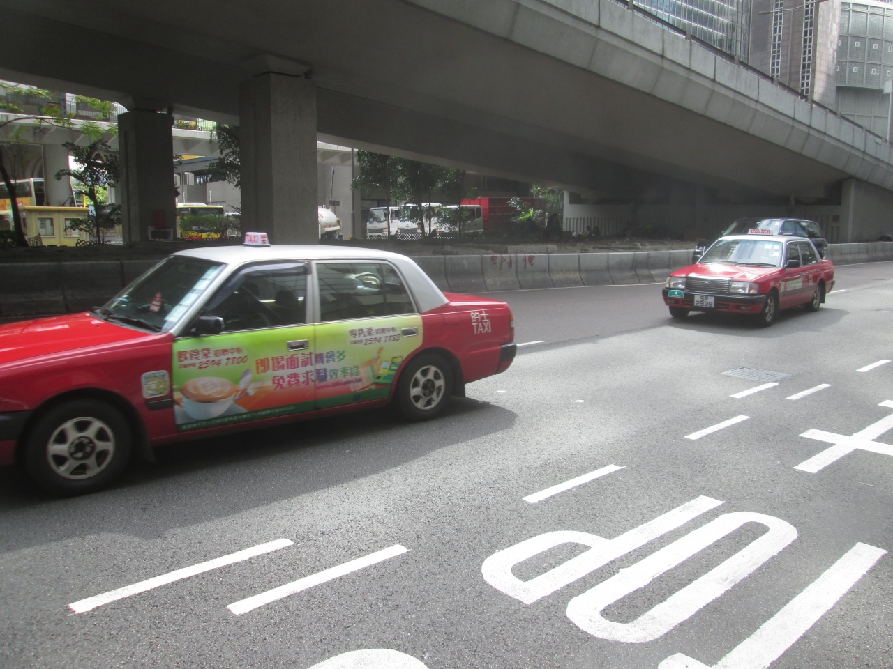香港のいたるところを走行しており、24時間たくさんのタクシーが走っています。日本と同様、空車の場合、運転席のランプが光っていました。日本と異なるのは、ボディーのカラーが1色に統一されており分かりやすかったことです。また、後部座席に座ることがほとんどですが、助手席に乗車している人がいました。