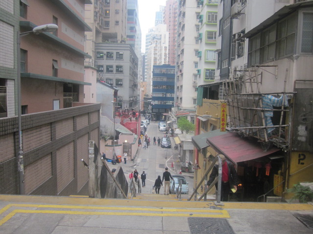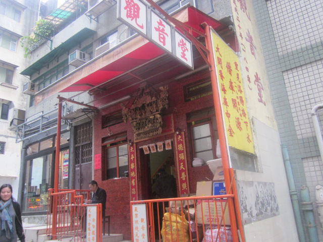香港古道ウォーキングの途上、太平街区の階段の最上段脇にあるのがこちらの観音堂で、会談中腹にある水月宮とは似たような風情ですが、階段を挟んだ反対側にあります。お堂の入口に、怖い顔をしたおじさんが座っていて、ちょっと中には入り辛い雰囲気でしたが、階段の最上部に立地しているので、ここから見下ろす太平街の景観は、なかなか良かったです。