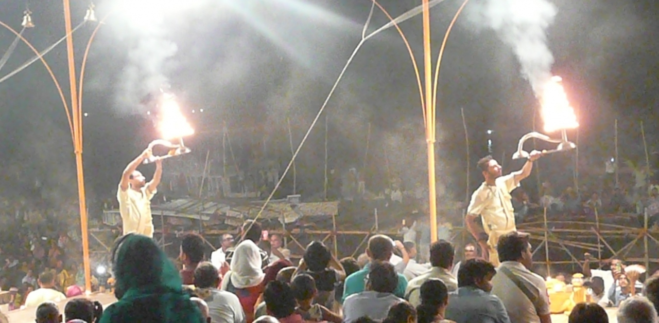 日が沈む11月初旬の夕方、ガンジス河畔のハリシュチャンドラ・ガート Harishchandra Ghat でアールティと呼ばれるプージャの見学に出かけました。
