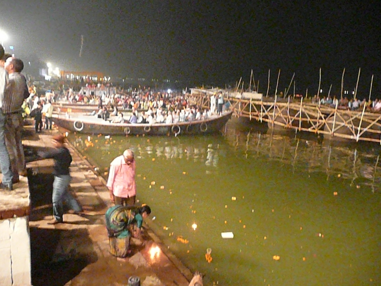 終盤になったときに舞台の反対側に回ると、そこはガンジス河の岸辺でした。水上では、ボートに乗って儀式を眺めている見学者もいました。