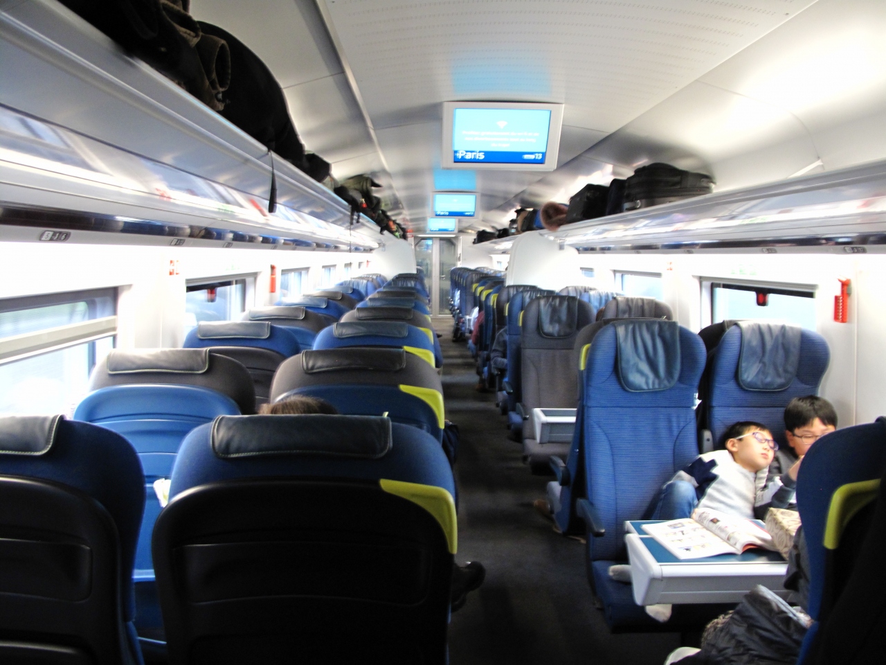車両にはスーツケース置き場があり、席の頭上にも荷物置き場があります。二等でもシートはゆったり。座席は車両の中央を向くように配置されていて、私達の席は進行方向の反対向きでした。四人グループ用の席もあります。
