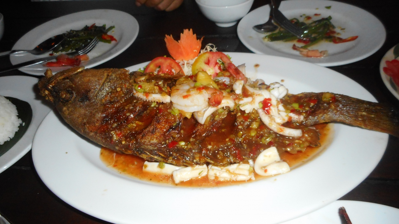 3名で生ビールに魚料理に海老入りスープに空芯菜炒め、きのこ炒めにご飯、お腹いっぱいの量で1400バーツでした。
