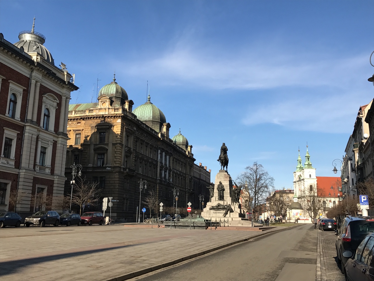 クラクフ中央駅の周りは少し近代的な雰囲気もありますが、この広場の辺りまで来るとヨーロッパ的な街並みになります。