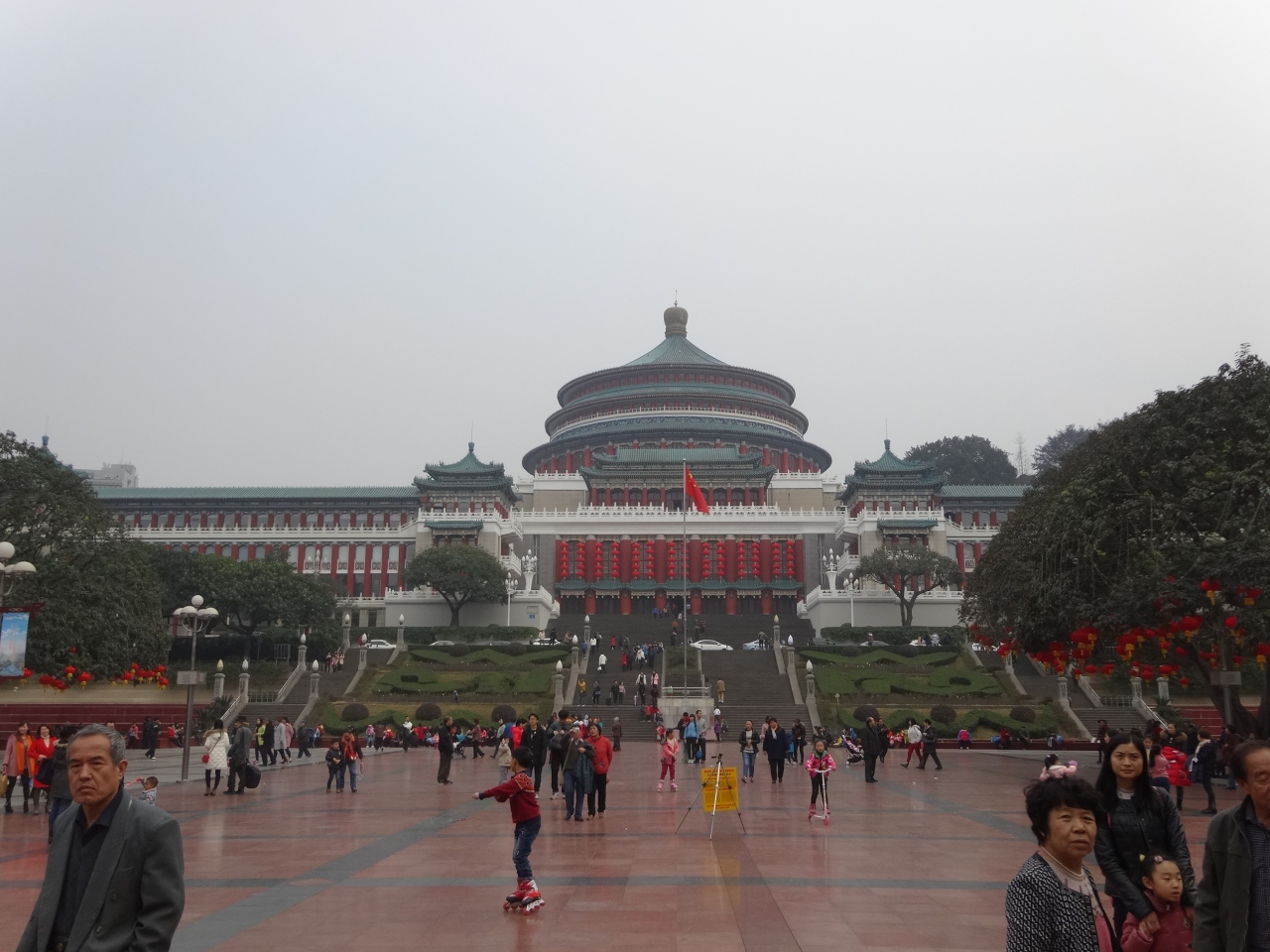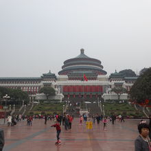 赤と緑の配色が、社会主義の中国らしい建築物です。内部は無料で見学できたのでのぞかせてもらいました。ホールの椅子はふかふかしているので、街歩きの際の休憩にちょうど良いです。建物の前には重慶人民広場が広がります。