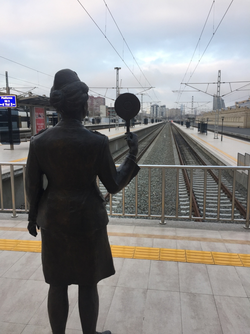 駅のフラットホームにはユニークな銅像が立っており、写真を撮っている人もいました。