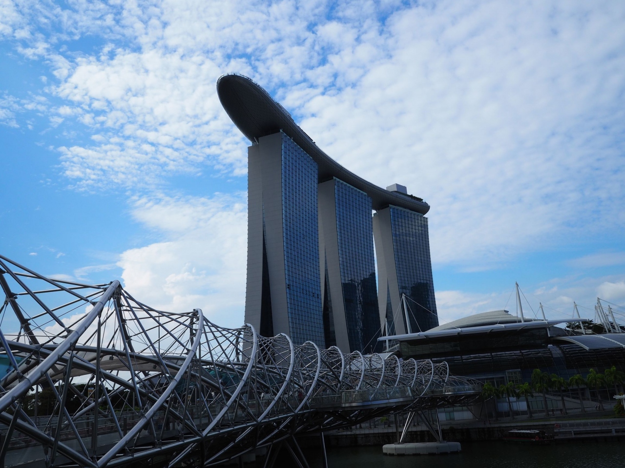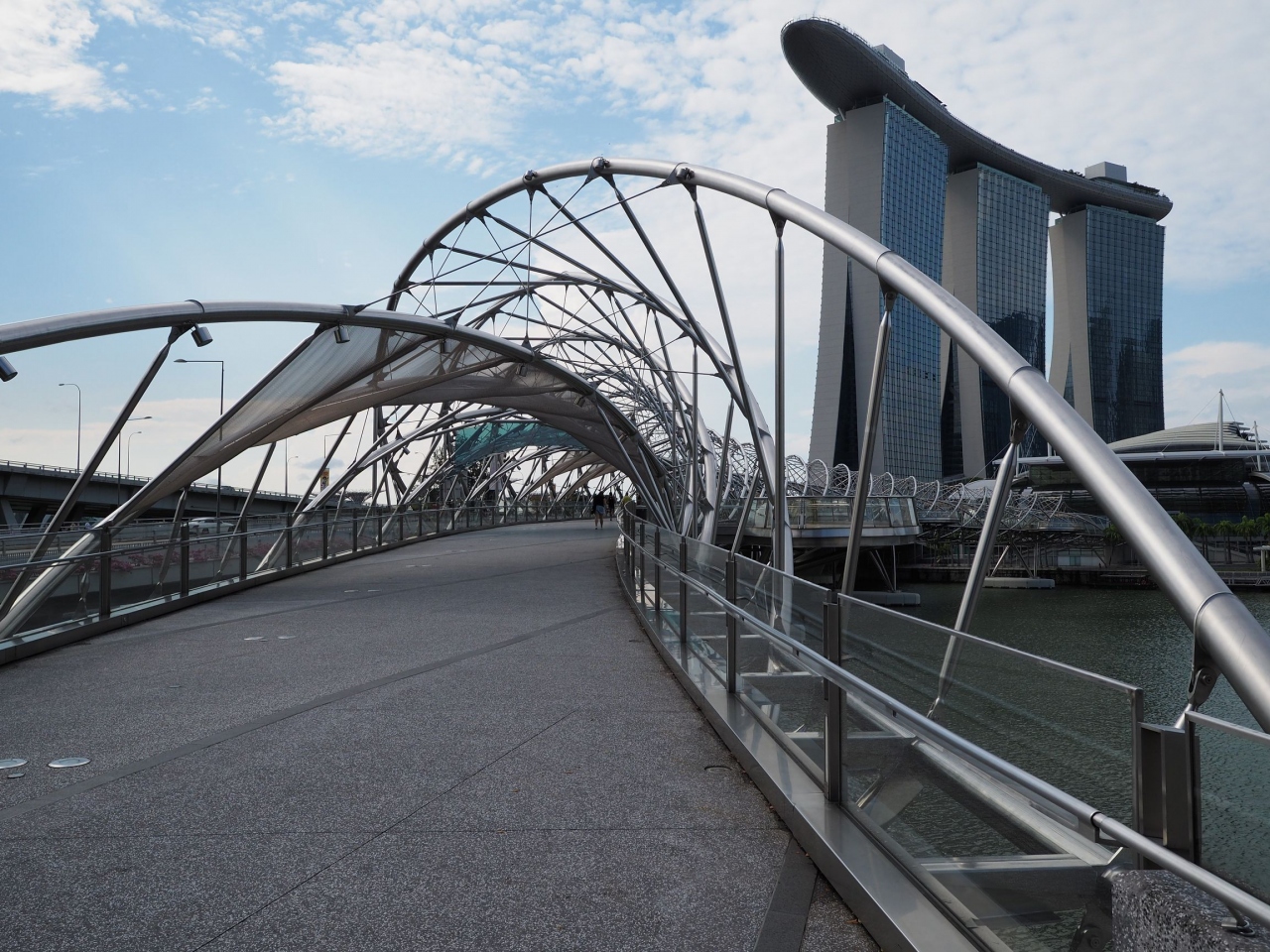 マリーナベイ・サンズとマリーナ・プロムナードを結ぶ歩行者専用の橋。螺旋模様のデザインが施された鉄製の橋で、途中に展望台が設置されていてホテル・マーライオンを望むことが出来ます。夜になると、イルミネーションが輝きマリーナ湾に浮かび上がってとても幻想的です。雨が多いシンガポール、屋根が有るとありがたいのですが、残念ながらここには設置されていません。