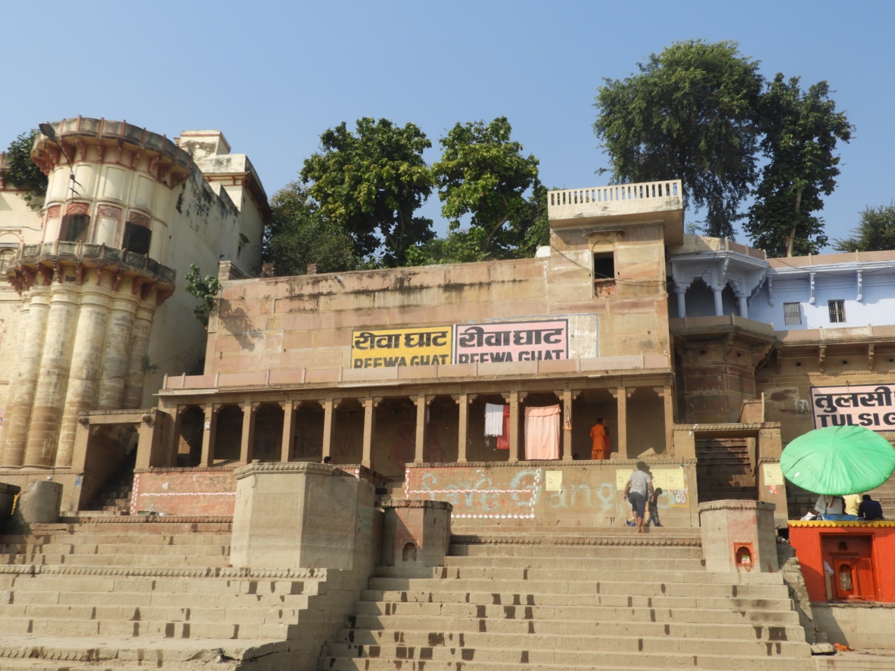 一方、ガートの上を眺めると、両翼に砦の様なタワーを備えた古びた建物が築かれていました。それはララ・ミシアと言う僧侶によって建てられた建物でしたが、19世紀後半にリーワー藩王が買い取ったので、このガートはリーワ・ガートと呼ばれるようになったそうです。現在は、Banaras Hindu Universityの所有となっています。