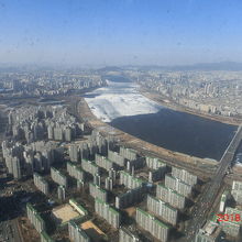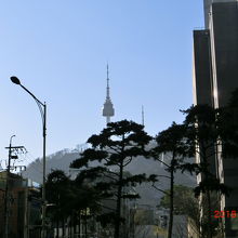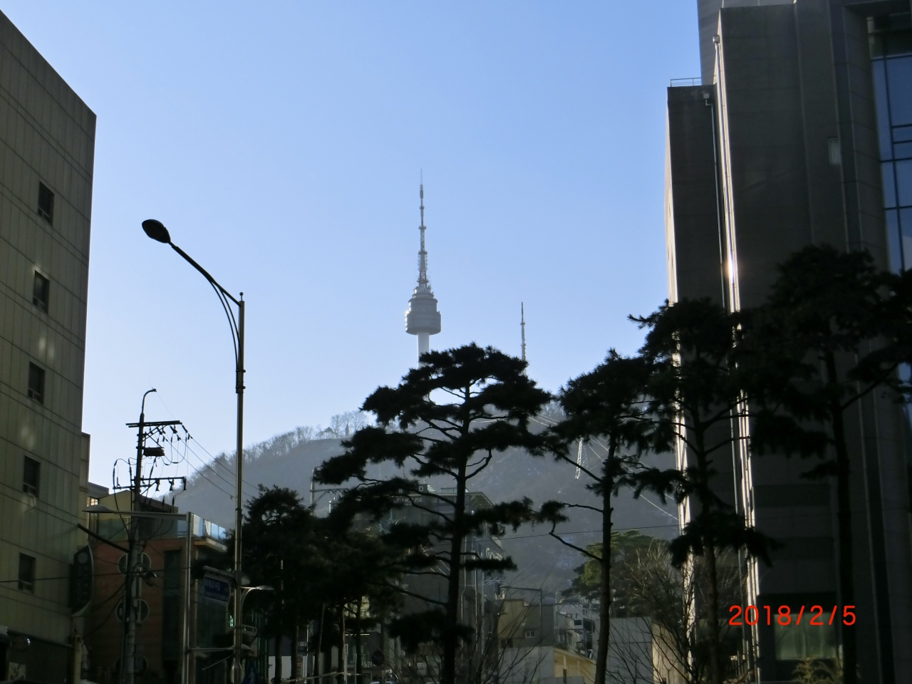 ソウル中心街の遠望で漢江沿いの小山の上に聳えているNソウルタワーが見えました。