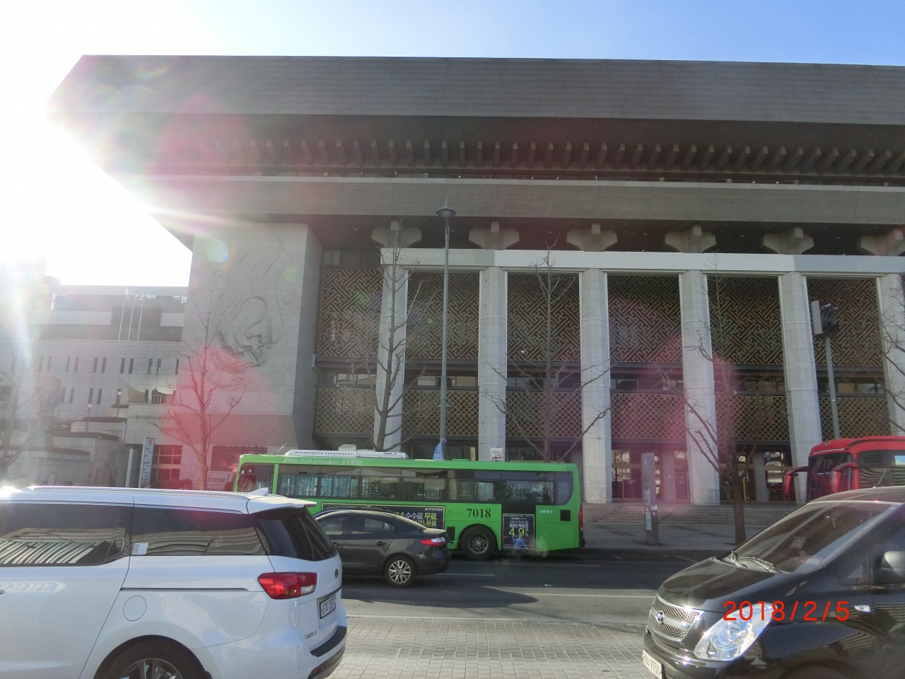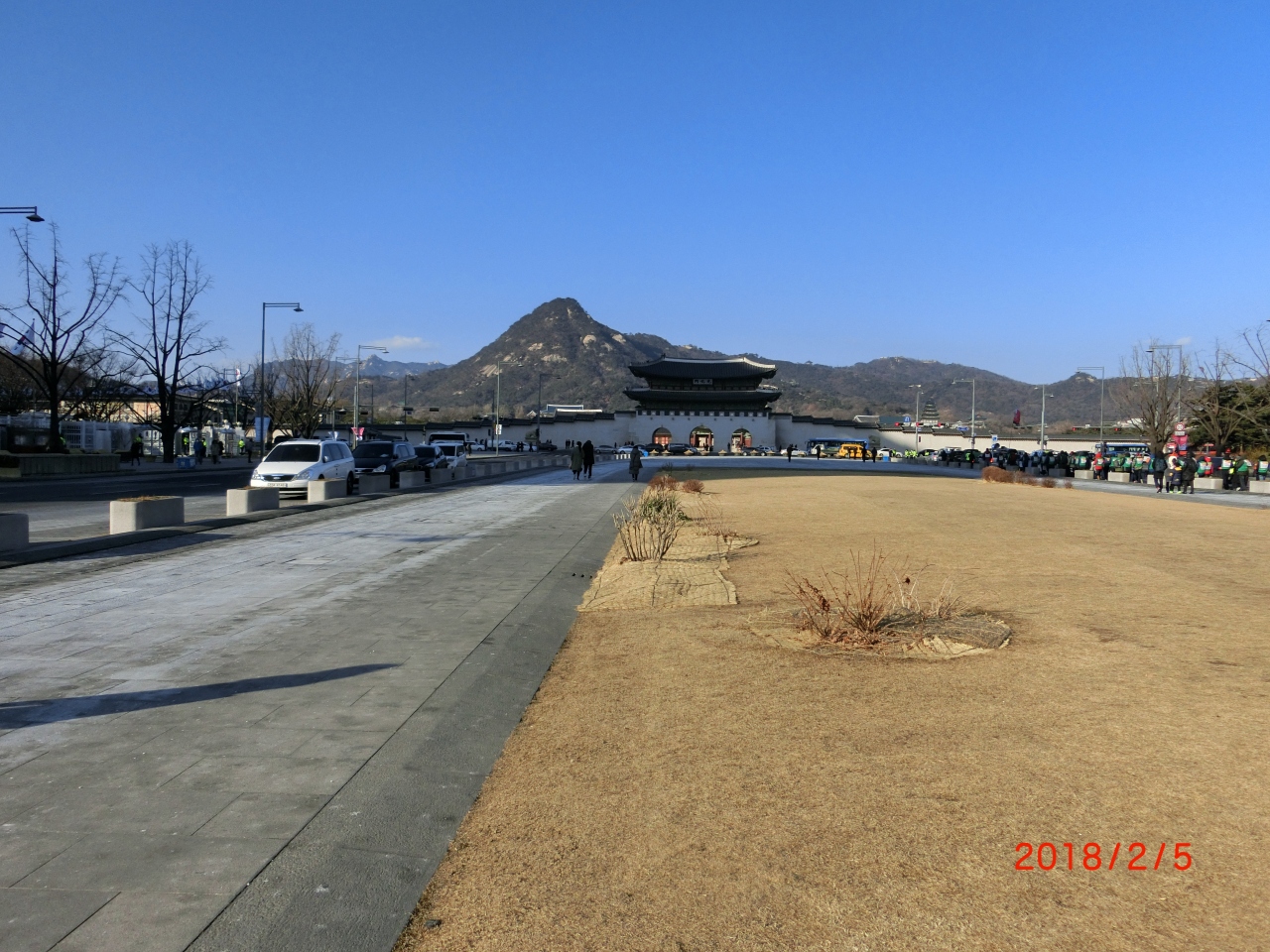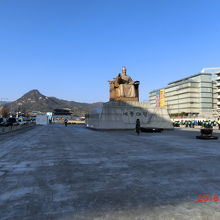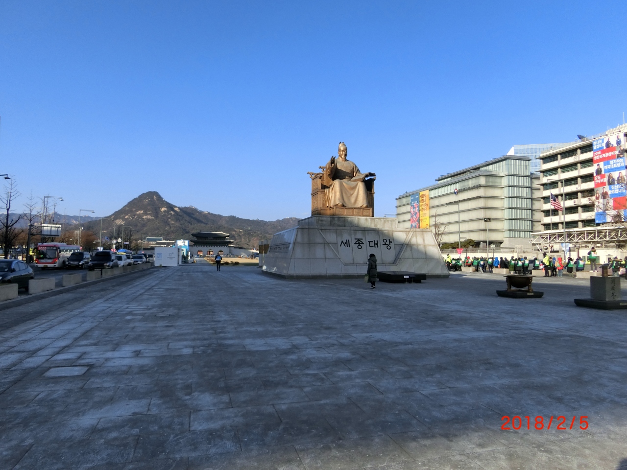 光化門広場を見ると世宗大王 銅像とその後ろに