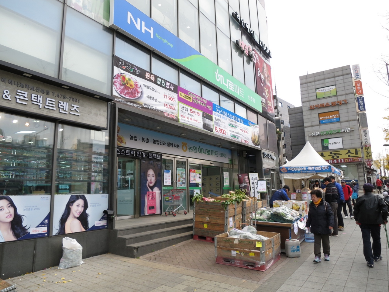 農協系の店だけに野菜や肉などが主流のようですが,韓国海苔やお菓子類など安い土産物も置いてあるので,散歩がてらに行ってみるのも良いと思います。…新村店は地下鉄の駅から5分ぐらいの所にあります。