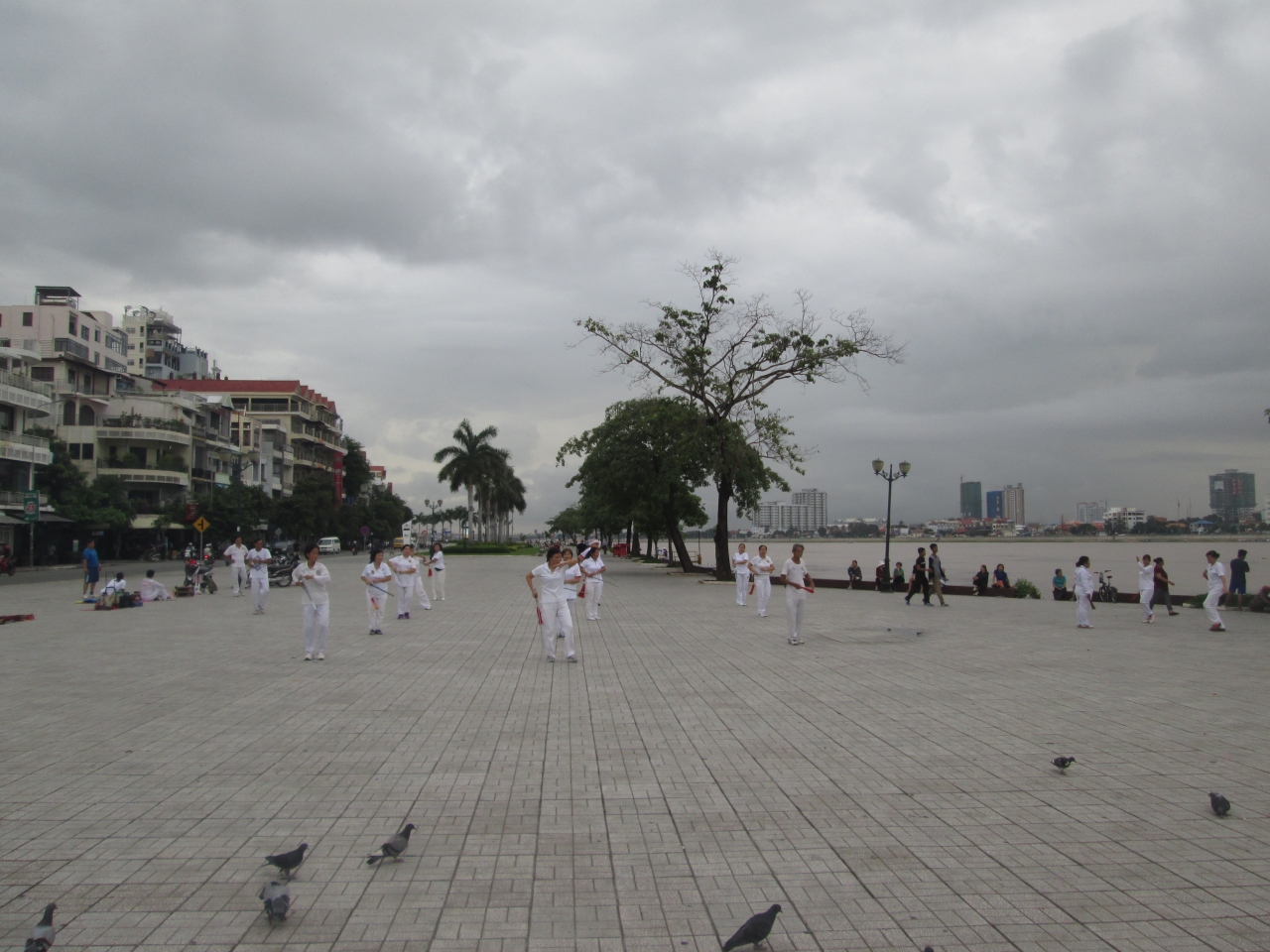 朝のトンレサップ川に訪問しました。日中や夜間は人通りが非常に多い川沿いですが、朝の時間帯はゆったりとした時間が流れ静かでした。中高年世代の人たちが専用衣装に着替え太極拳や体操を行っている東南アジアならではの光景を見かけました。