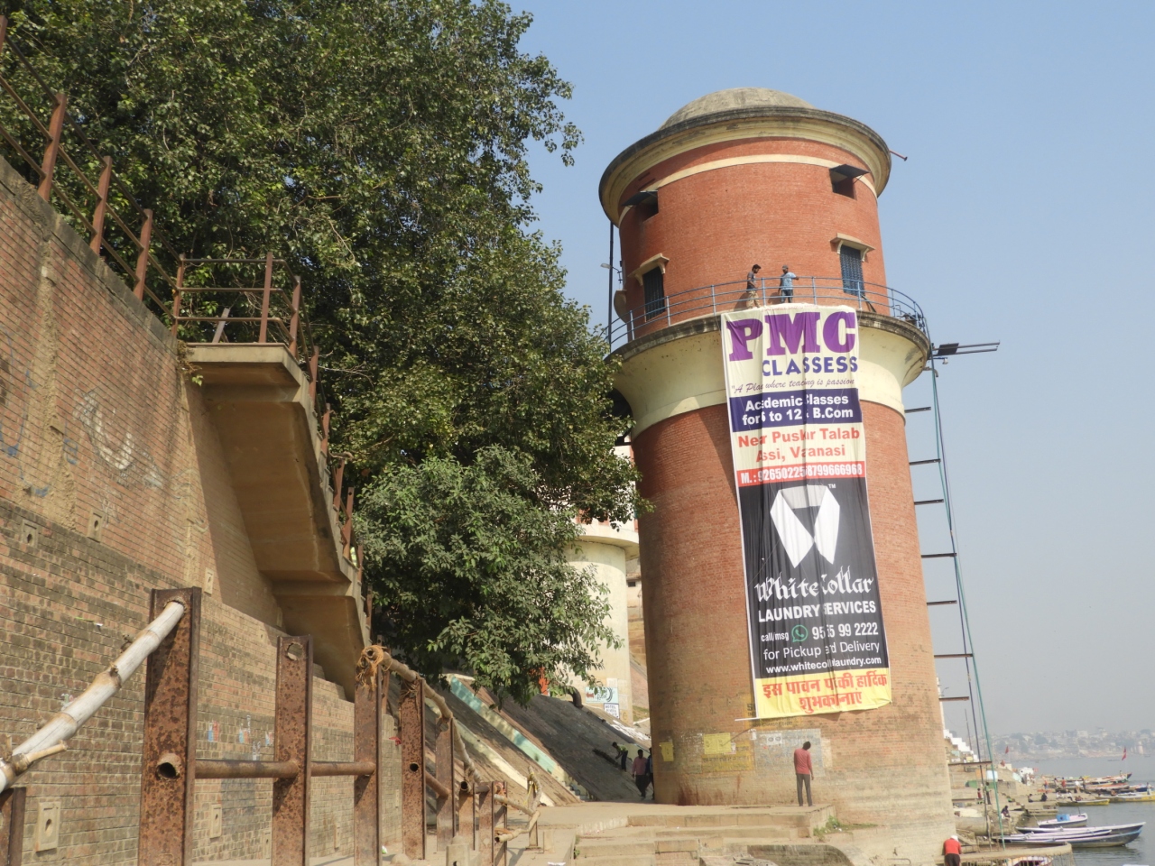 このガートには、赤煉瓦造りの巨大な円柱タンクがそそり立っていました。それは、ヴァラナシ市当局が建設した取水場の取水タンクでした。このタンクの付近には、他にも白っぽいタンクとか、関連施設が築かれていました。