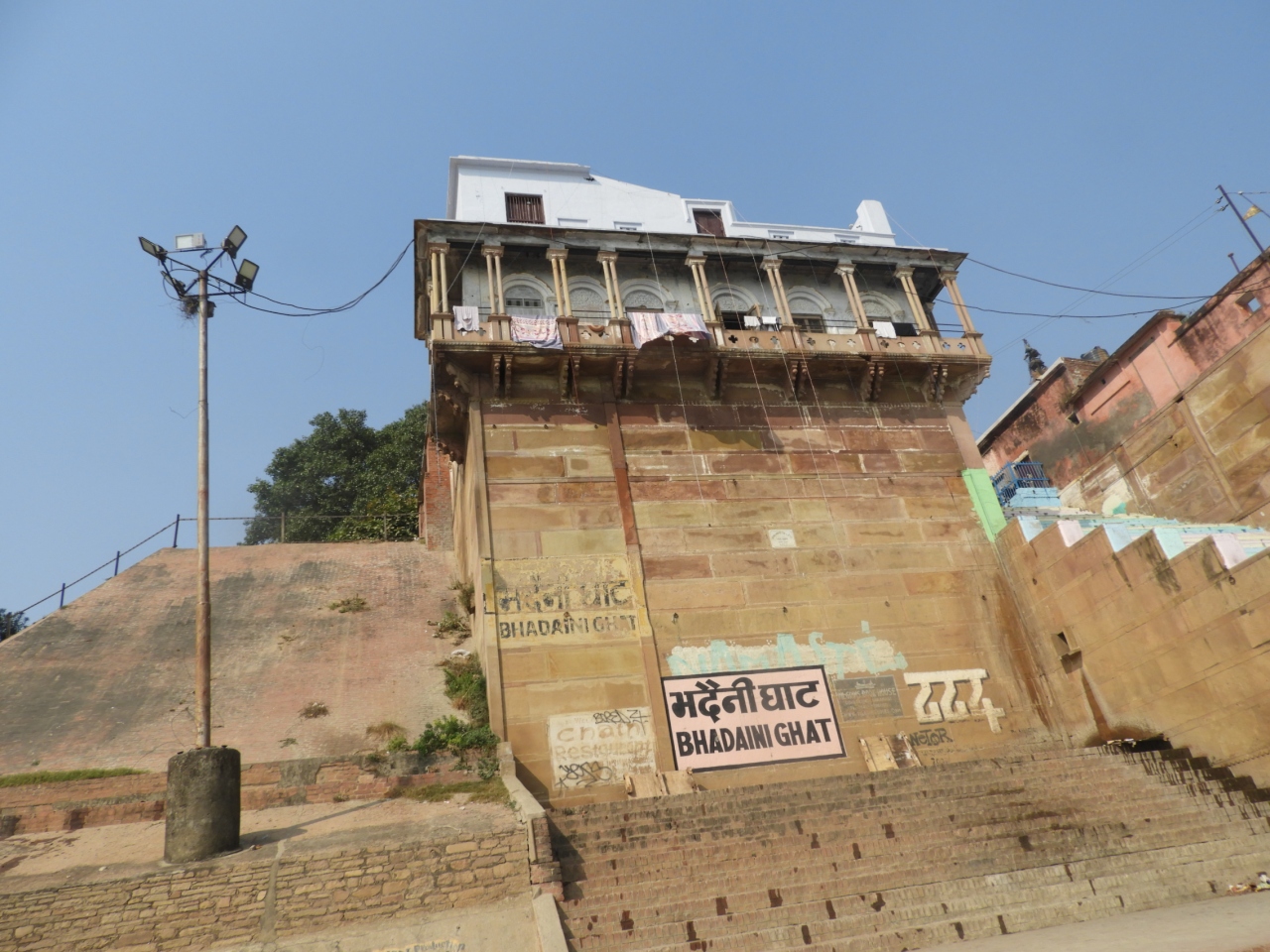 タンク類の近くには、上部に邸宅が築かれた城壁の様な石壁があり、そこには“Bhadaini Ghat”と書かれた標識が描かれていました。