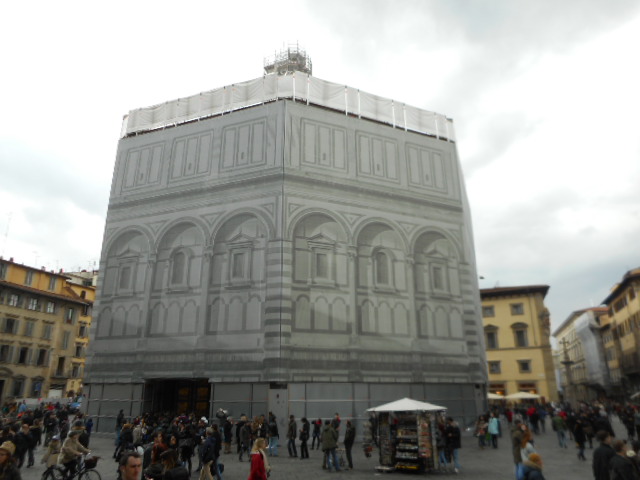 大聖堂前の広場で、大聖堂へは比較的早く入場できますが、ジェツトの鐘楼の順番待ちの列で混雑したり、土産物の露店商があちこちに在ったり、画家も多く居て、観光客相手に商売しているある意味で騒がしいエリアです。こういう場所には、行政の無料の休憩所があれば、歩き疲れにゆっくり休んで大聖堂を見学できるのにと思います。