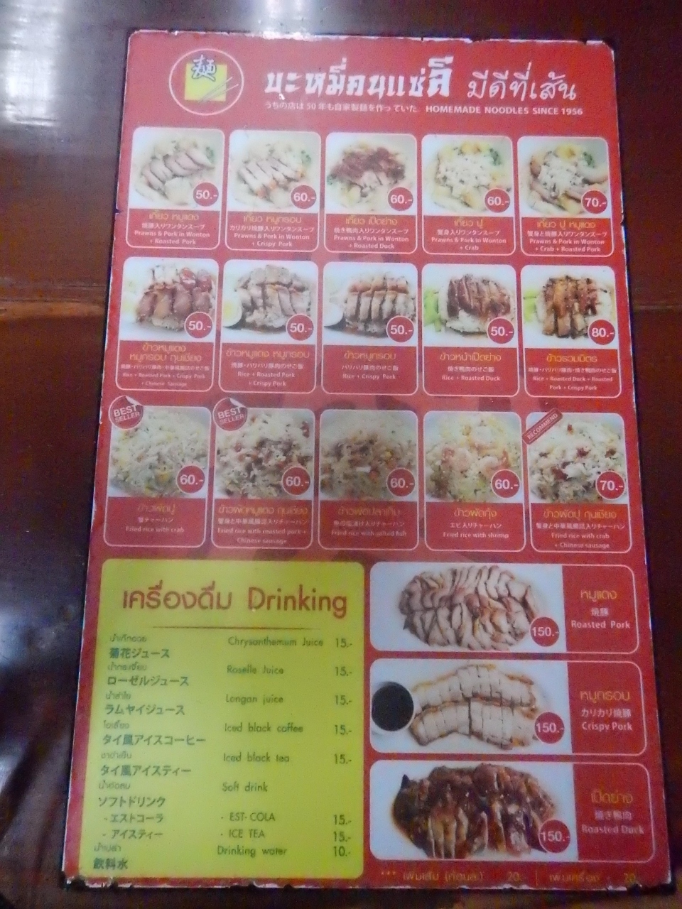 最近ではチャーハンが美味しいとガイドブックに紹介されていたが、ここではやはり麺を食べたい。チャシュー入りの麺を食べる。麵の量は少ないが、適度な硬さがあって美味しい。1杯40バーツと安いのもよい。メニューには日本語も書いてあるので注文しやすい。