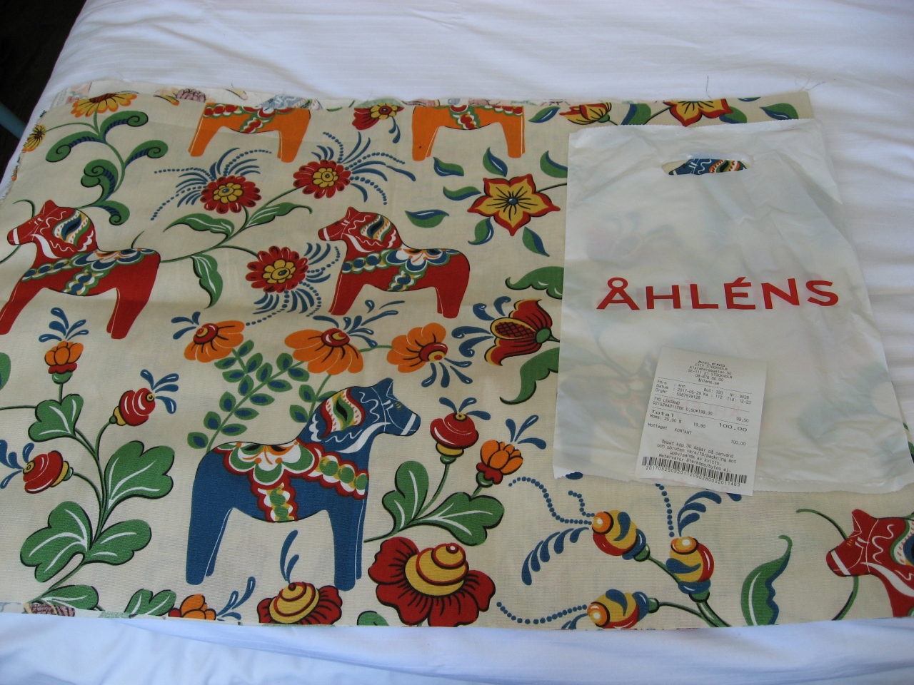 ブラブラしていると生地屋さんがあり覗いてみると、スウェーデンぽい可愛らしい柄がありましたので購入、日本と同じで欲しい分の長さを言って切ってもらいます。