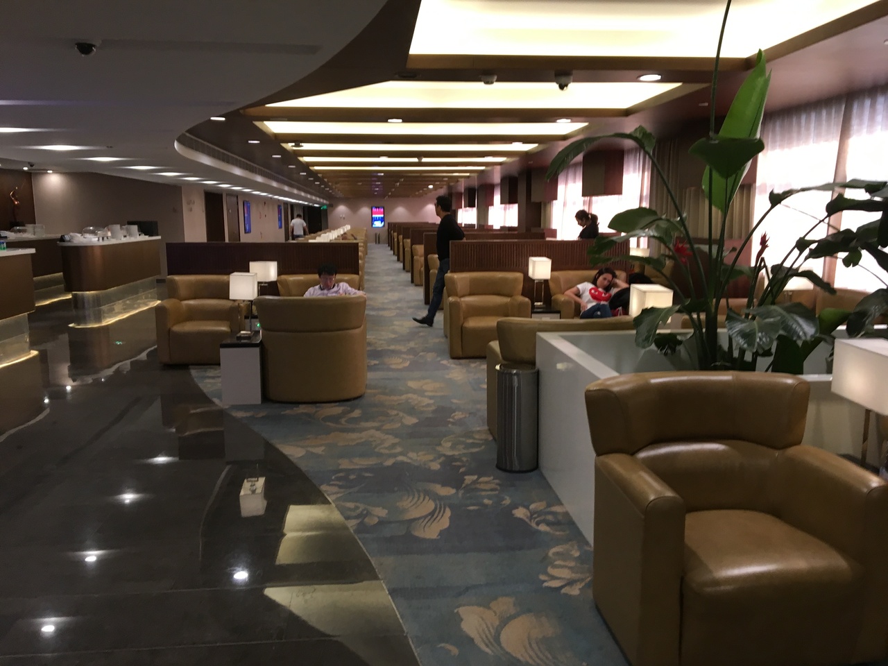 非常にわかりにくい場所にありました。出国検査後に案内はあるもののわかりにくいです。出国検査後すぐ右手のエスカレーターを上ると、ラウンジが並んでいました。入室後さらにエスカレーターを上がったところにも椅子があり、静かですが、食事類は入室した階にあります。ヌ一ドル、包子もありました。