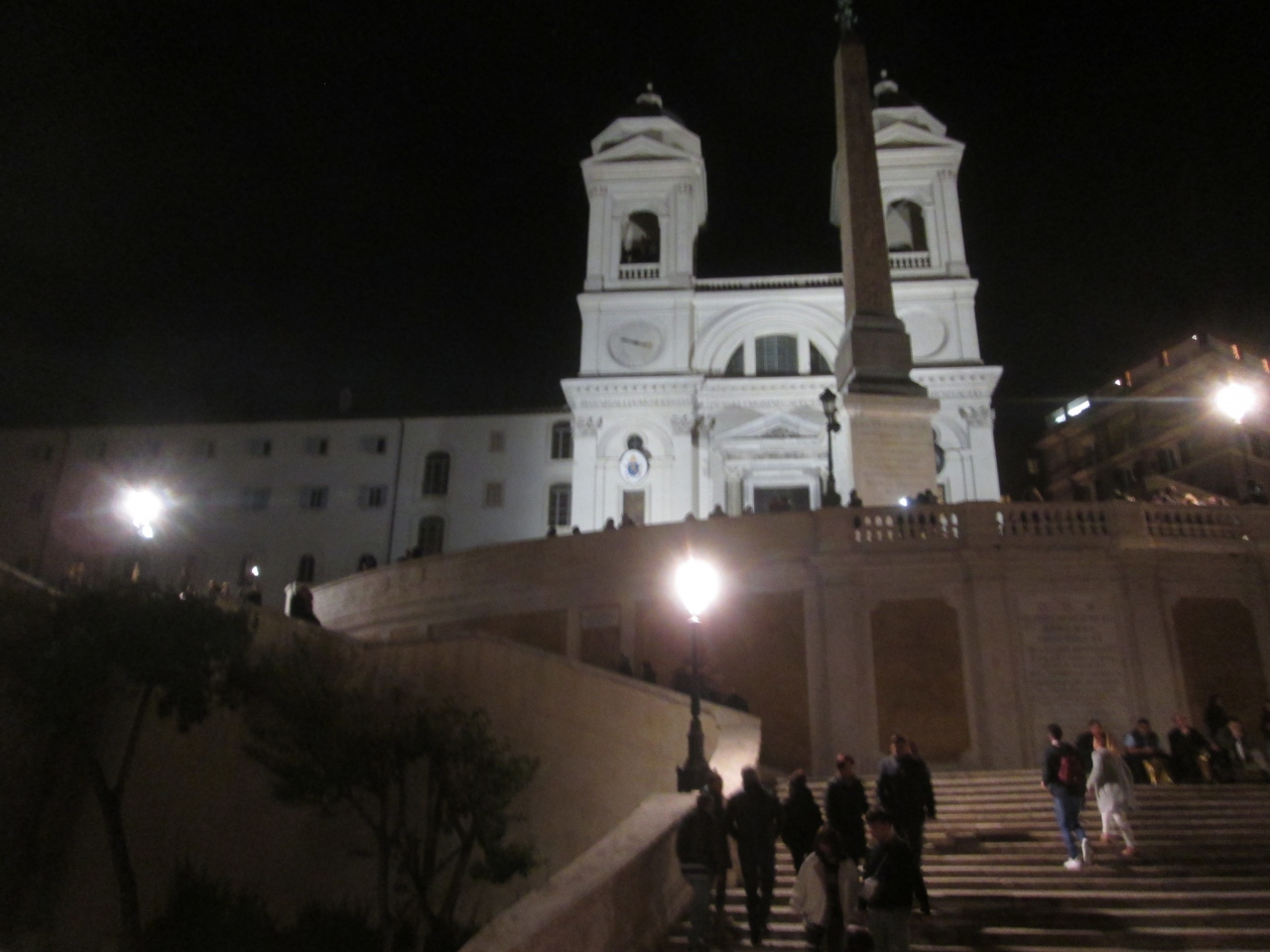 夜のトリニタ デイ モンティ教会に訪問しました。周囲がすっかり暗くなっていても、スペイン広場からこの教会まで続く階段には多くの人たちが残っており、ついでに礼拝のため教会に足を運んでいました。治安的に不安に感じることはなく、ライトアップされてきれいな教会を見ることができました。