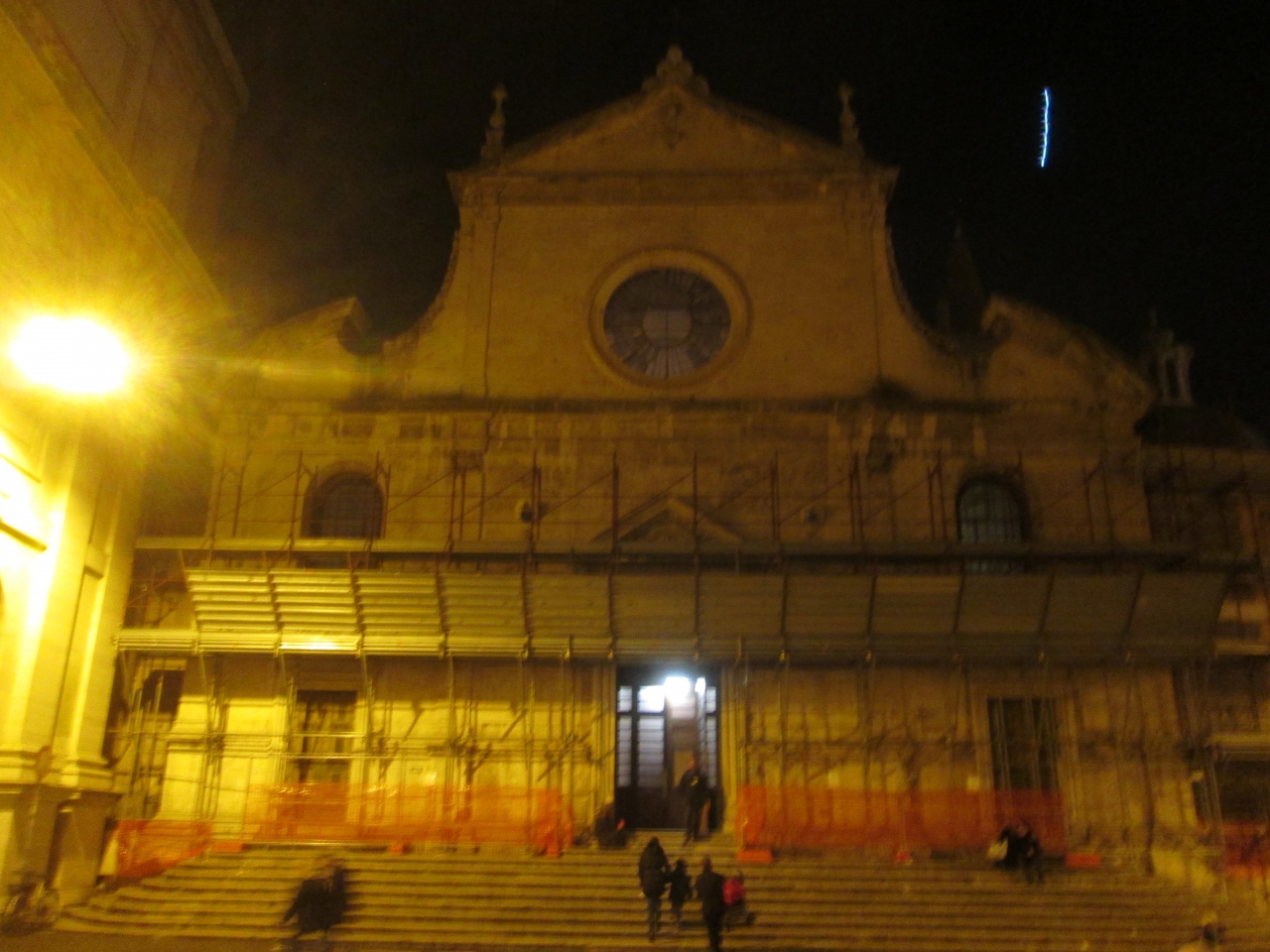 夜のサンタ マリア デル ポポロ教会に訪問しました。中を見学しようと入ろうとすると、入口に係員がいて静止されました。運が悪く、なかで特別なミサを行っているようで、中に入ることができませんでした。その代わりにライトアップされてきれいな外観を見ることができ、日中と異なる景色を見れて良かったです。