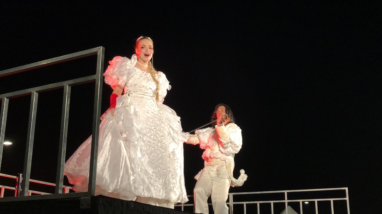 パレードやオペラショーが催され、最後は大きなクレーンに吊られて