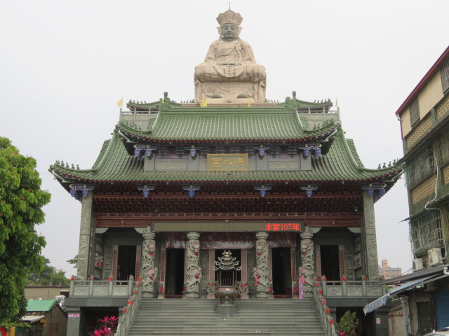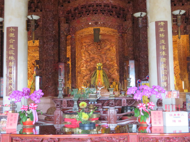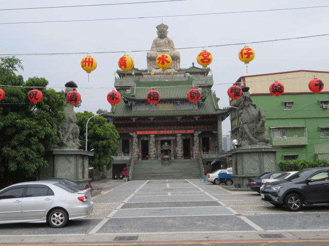 蓮池潭の東岸にある寺院、西岸には多くの派手な造りの寺院がありますが、東岸にはないので遊歩道を散策している途中寄って見ました、珍しいのは寺院本殿の屋根に像があることです、建物が5階位の高さがあるので目立ちます、本殿内には台湾らしい仏像が安置されています、入口の石柱も台湾らしかったです。
