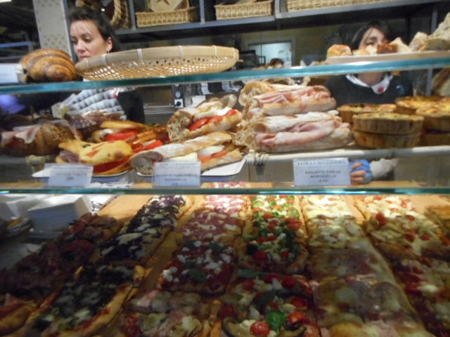 近年、人気になった”中央市場”はフェレンツェ駅近くあり、観光雑誌にも紹介されています。1階は食料品売り場が多く、2階はオープンキッチンのレストラン、バールが営業していて、真中の大きなテーブルで、各自、購入したメニューを食べられるようになっていて、大勢の人々で賑やかです。自分達はピザとケーキを食べましたが、味はまぁまぁでした。