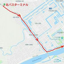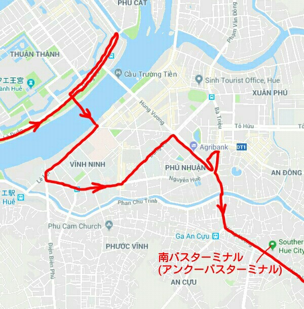 ルートの詳細は北バスT、Ly Thai To、Le Duan(フォン川の手前を左折)、Tran Hung Dao(ドンバ市場まで行きUターン)、フースアン橋、Le Loi、Nguyen Hue、Dong Da、Hung Vuong、Big Cの前でUターン、Big C裏を回り込み再びHung Vuong、南バスT前で降りました。ここまで乗って1万ドン。バスはそのまま南下しフーバイ(空港)を通りランコー(ビーチ)まで行きます。ちなみにBig C前からランコーまでは3万ドンです。もちろん逆のルートで南バスTから北バスTまで行けますがルートが若干異なるかもしれません(未確認)。