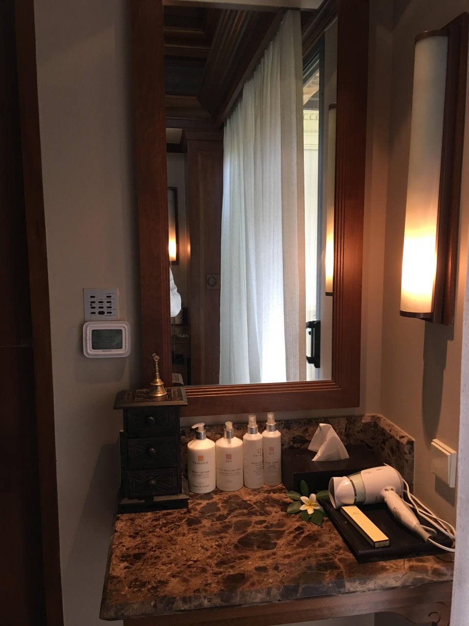 長い廊下を通るとセンターオフィスがあり、予約の旨を伝えると問診票を書くように言われます(英語表記)。そこでは冷たいハーブティのサービスがあります。程なくセラピストが来ますので、後に付いて施術を受ける東屋に行きます。東屋はお客様一組に付き1棟なので、完全プライベートが保たれ、シャワー・ジャグジー・アメニティ他すべてが整っています。ガウンと紙ショーツに着替えて、施術の部屋に行きます。