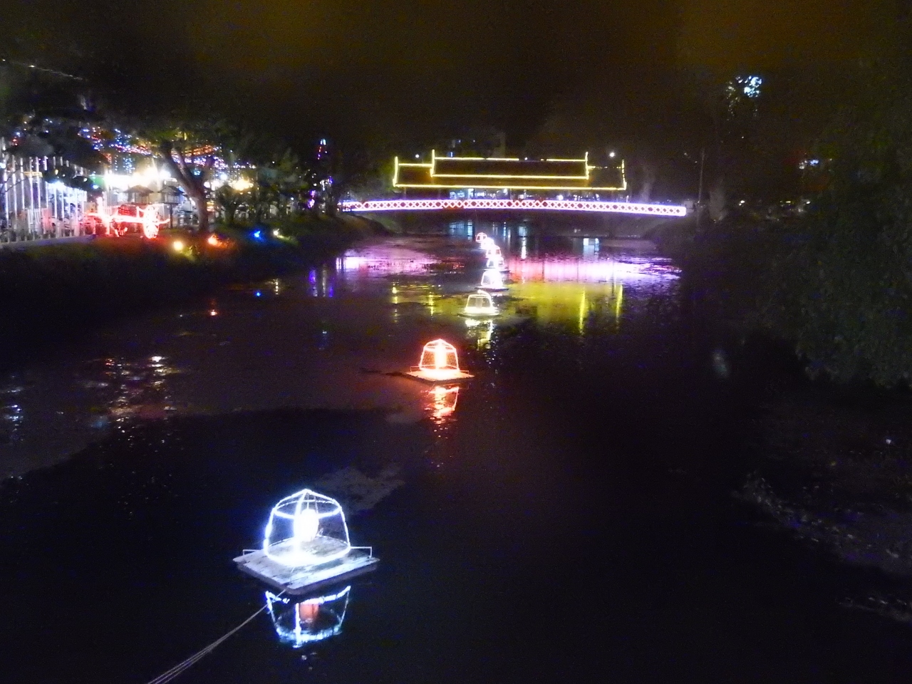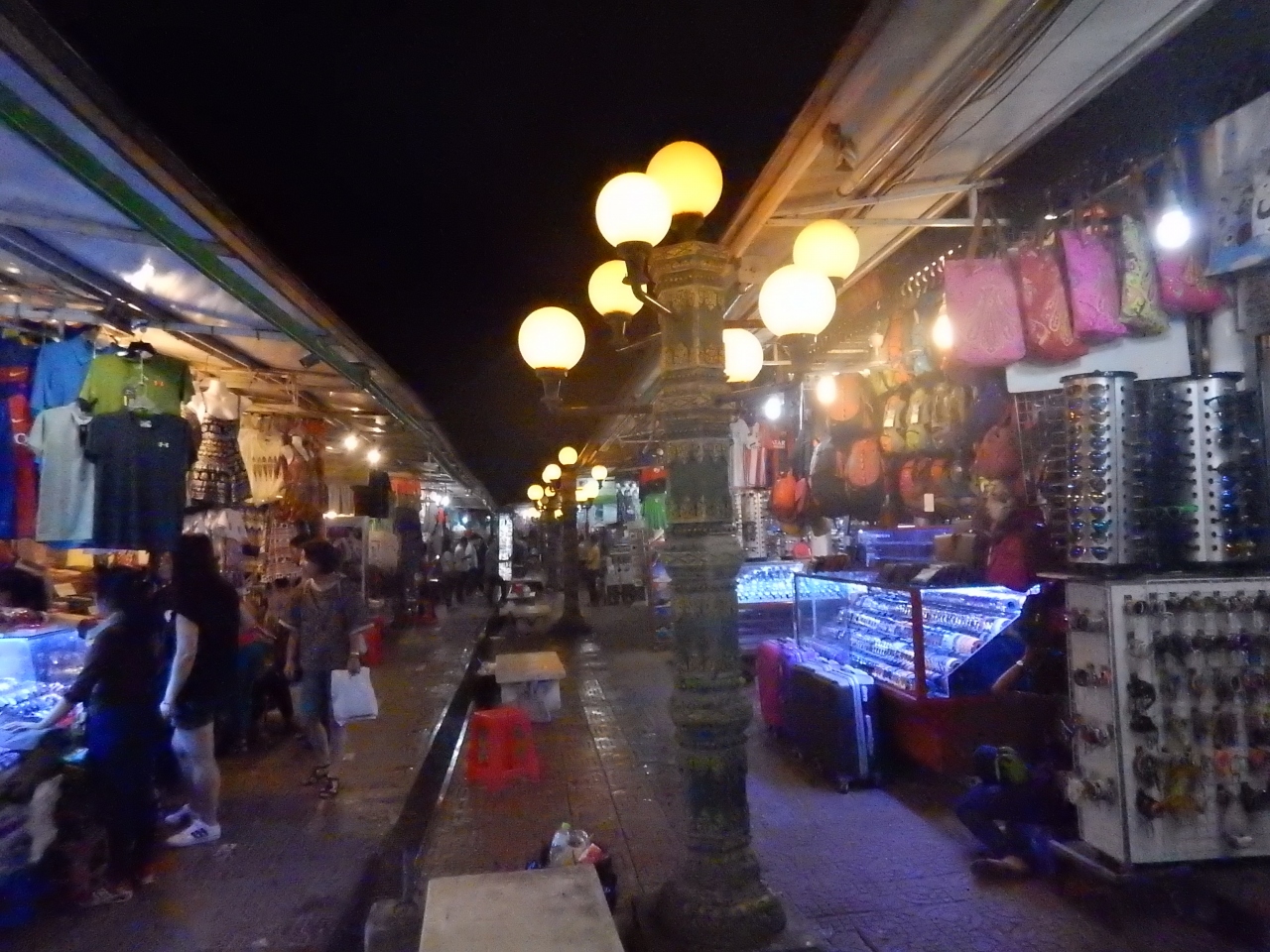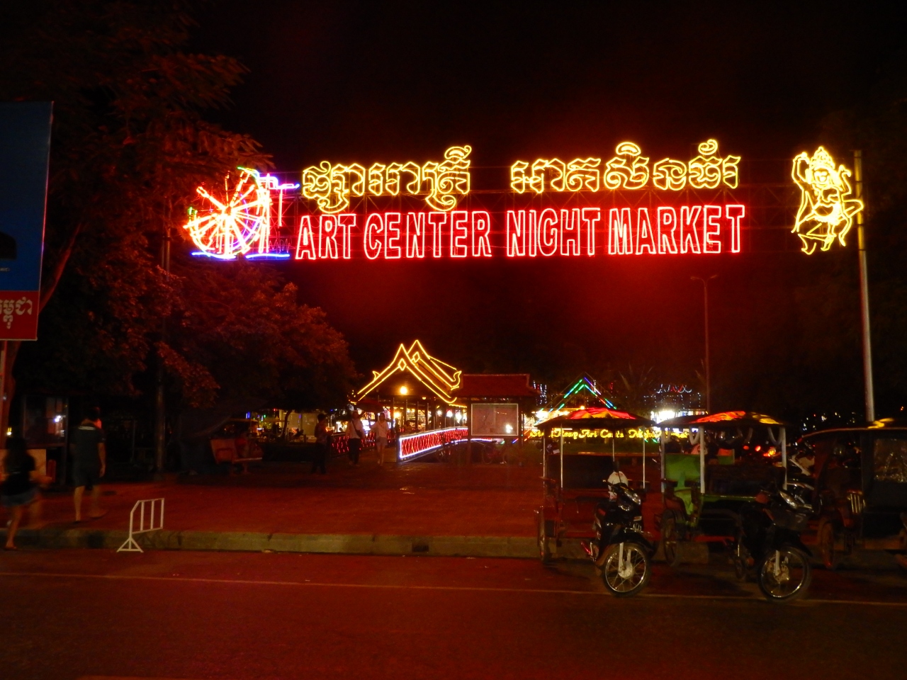 オールドマーケットからシェムリアップ川を渡り、アートセンターナイトマーケットに行く。橋は明かりで飾られ、川面には灯篭が浮かんでいる。昼間見ると大したことがない川だが、夜の景色はそれなりに趣きがあるのでよい。