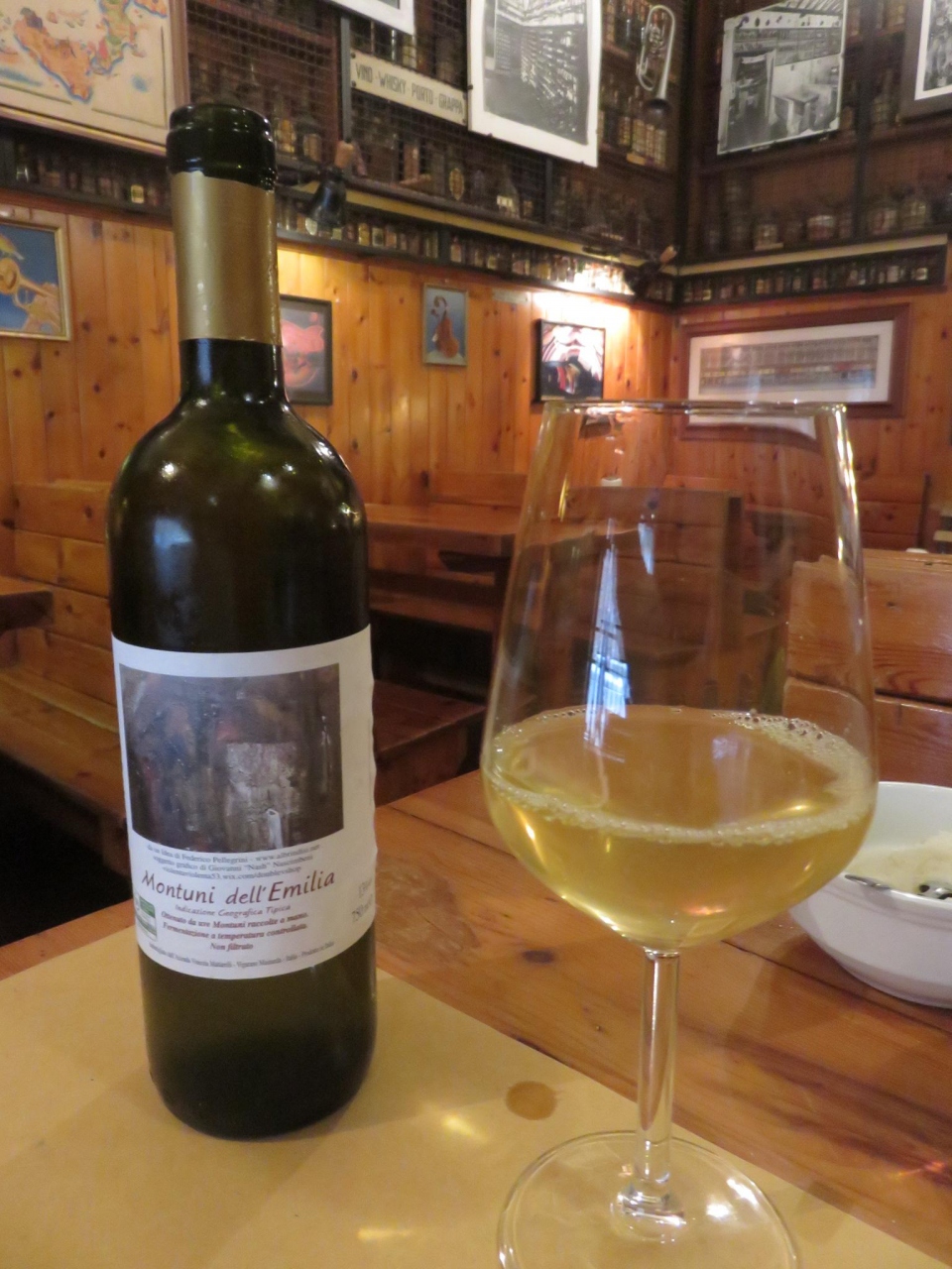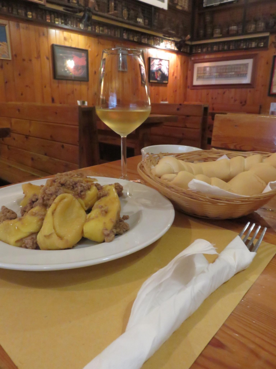 私は地元のパスタ(お勧め)10ユーロと白ワイン3ユーロ(フェッラーラ産)を頂きました。座席料2ユーロで合計15ユーロでした。