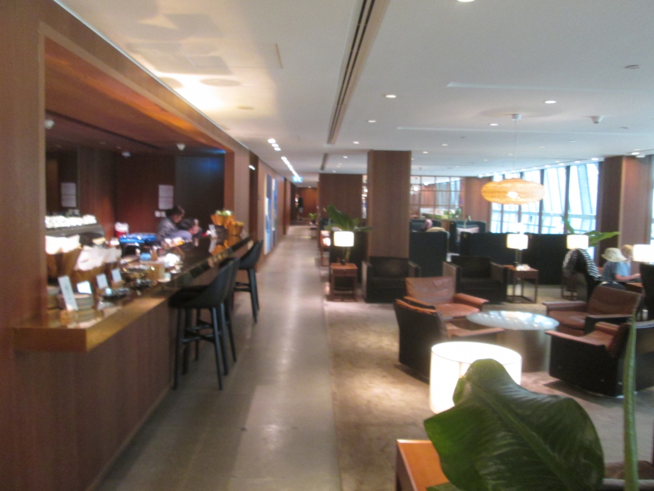 キャセイパシフィックのラウンジにバーカウンターがありました。入口を入ってすぐ右のところに高級感漂うカウンターがありセルフでなく、スタッフに作ってもらうスタイルでした。こちらは、上級ステータスのラウンジではありませんが、サービスの良さを感じました。