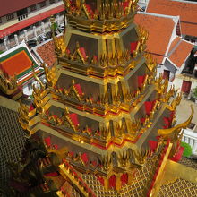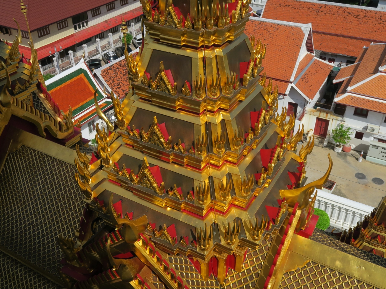 上階へ登るとバンコク市内の景色が見える展望エリアもある。またそこからはお寺の屋根構造を近い位置で見る事ができてなかなか良い。