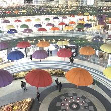 広いフロアのようなところに 傘をたくあん逆さまに吊り下げたオブジェのようなところがあり