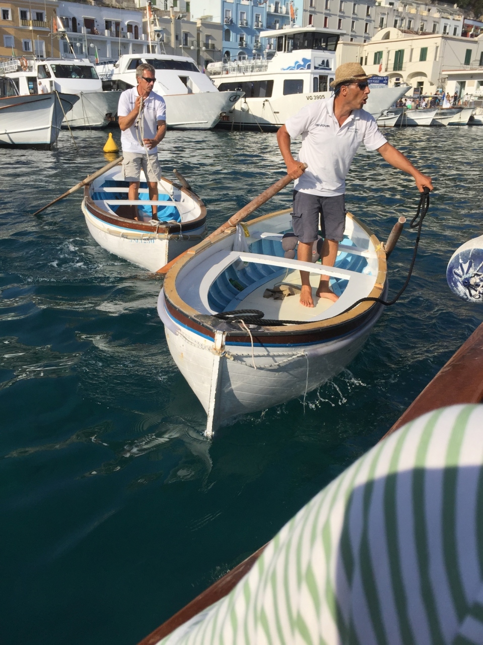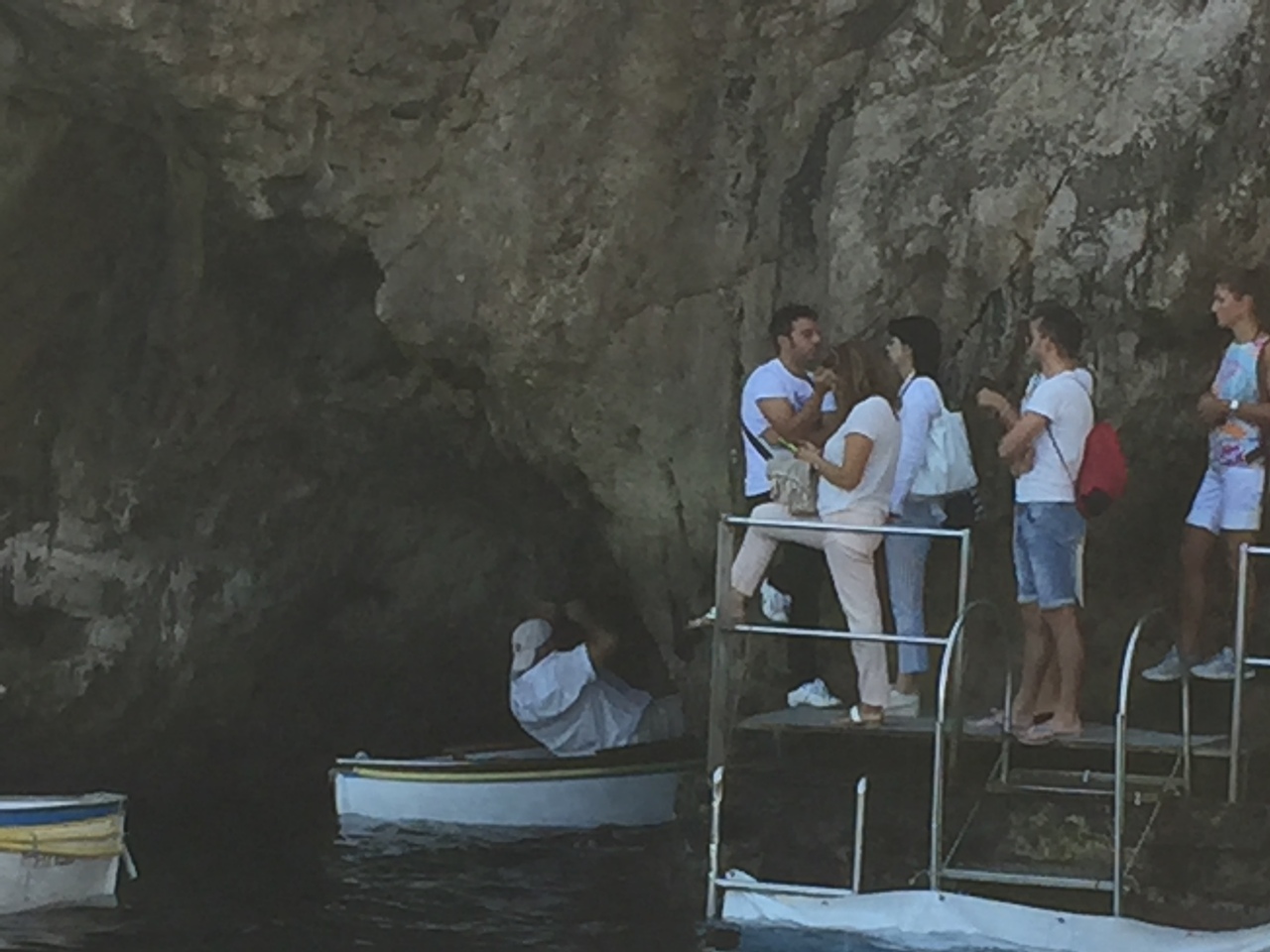 ホテルの朝食も取らずに、ナポリから2つの船を乗り継いで、洞窟前までやってきました。海が荒れていると、洞窟に入る穴が塞がってしまうため、入れないこともあるとのことで、この日は3日振りに入ることが出来たラッキーな日でした。