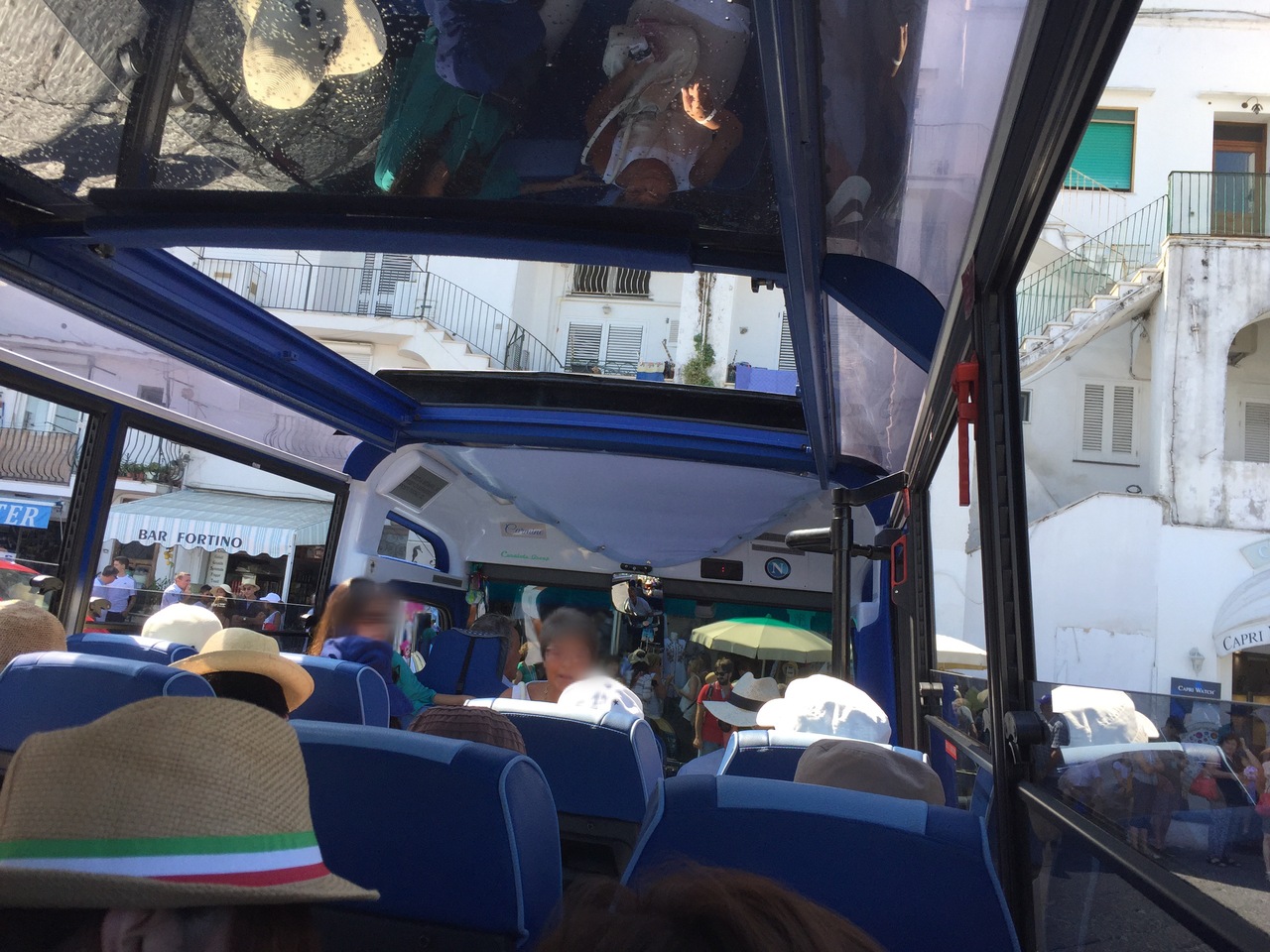 カプリ島の青の洞窟に入場した後に、ランチを食べるレストランがあるカプリ地区に行くためにバスを待ちます。かなり順番待ちが多く、現地ガイドさんが待ち時間が少なくなるように駆け引きしてくれたようです。それでも時間がかかるので、目の前のカプリウォッチのお店などで時間を潰しました。