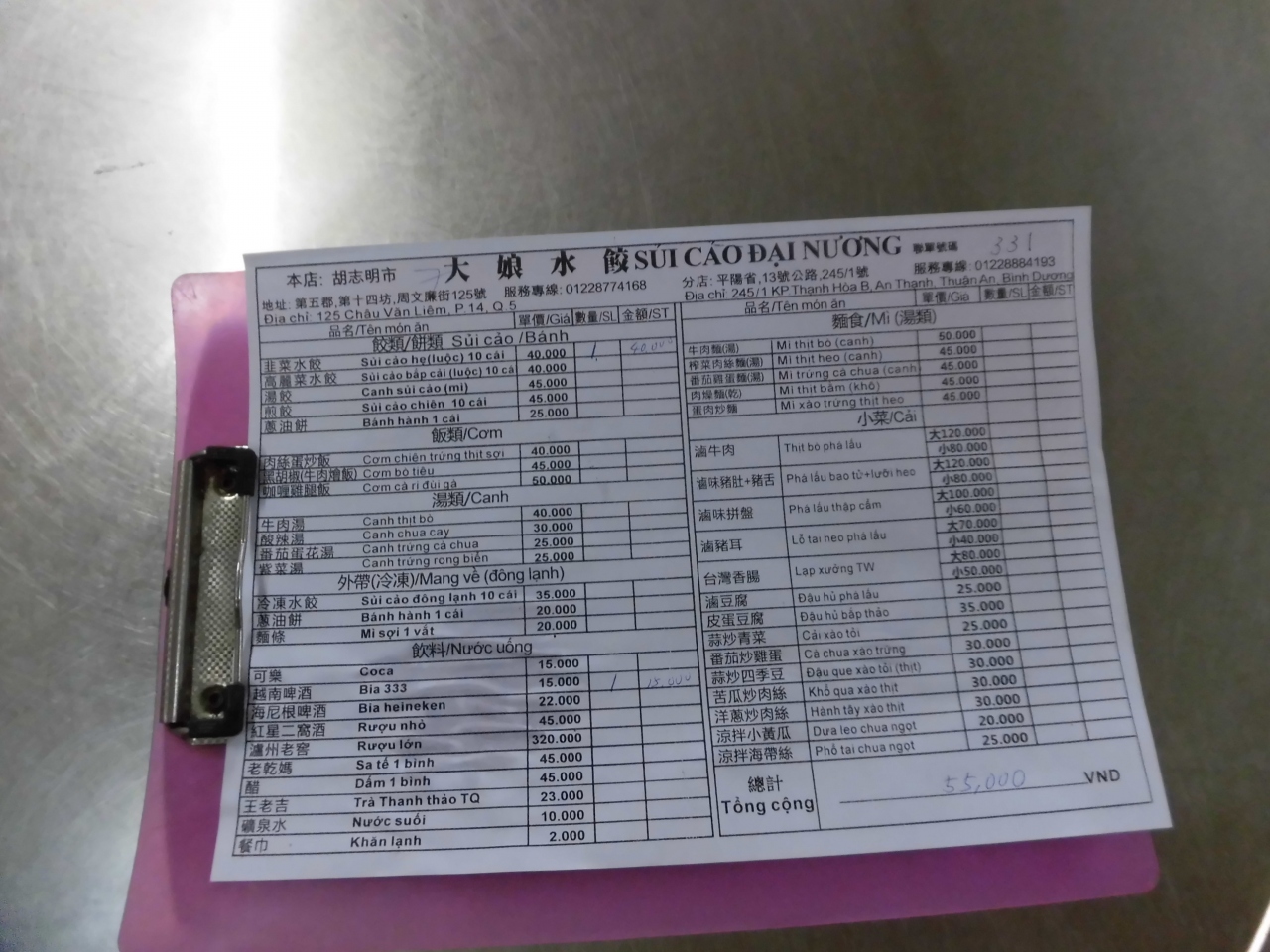 注文はシートにチェックを入れる形なので、極めて明朗会計です。ビールと餃子で55000ドンでした。