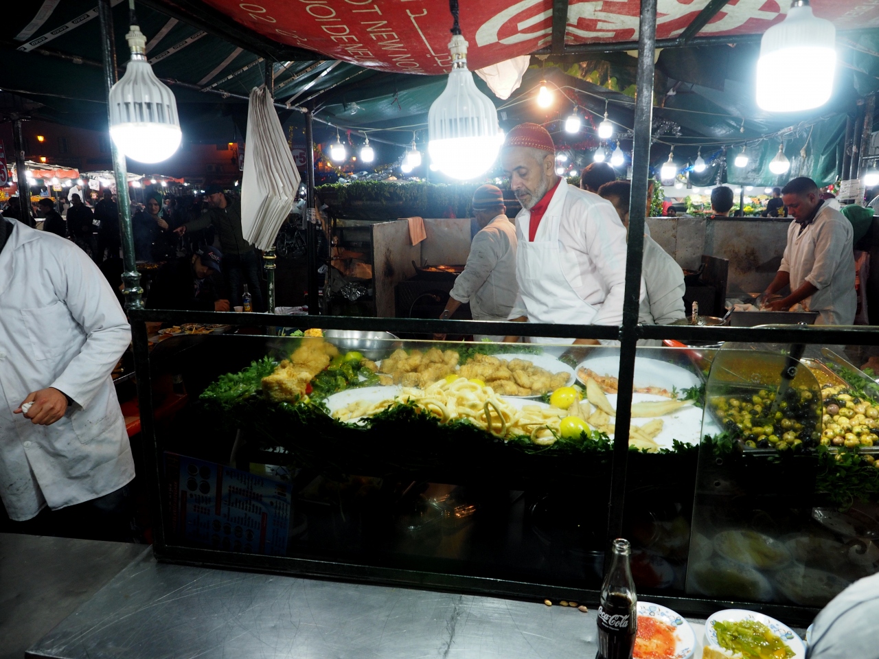 マラケシュ旧市街の中心にあるジャマエルフナ広場は、夕方からは食べ物の屋台が並び、ヘビ使いや踊や、曲芸師などの大道芸が行われ、毎日深夜まで大勢の人で賑わいます。